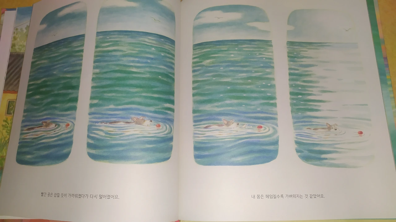 어둑한 골목을 거슬러 돌아가는 길은 풍경이 살짝 변했다. 전봇대 아래 자전거는 어디론가 사라졌고 빨랫줄이 늘어지도록 널린 미역들은 걷은지 오래다. 담벼락 위에 웅크린 야옹이는 잠을 청하고 있다. 할머니와 하나는 내일도 그다음 날도, 비슷한 시간에 같은 길을 따라 바다로 향할 것이다. 하나 입에 물린 레드 또한 통통대는 웃음을 지으며 동행하리라. 날씨가 화창하다면 운때가 맞는다면, 어쩌면 그들은 다시 그 섬을 찾을지 모르겠다. 앞장선 레드가 길을 인도하고 하나 곁에는 또 다른 견공들이 함께하리라. 색색의 공으로 넘실대는 섬이 어서 오라 손짓하고 뭉툭한 꼬리를 살랑인다.