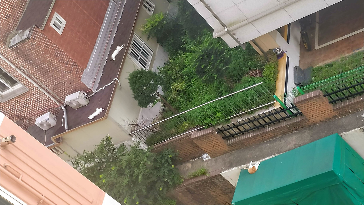 얼마 지나지 않아 낯선 이방인이 발을 들인다. 하얀 털이 온몸을 덮은 길냥이가 눈치를 보다 살금살금 다가온다. 녀석은 옆 빌라 처마 지붕에 자리 잡고는 털썩 누워 버린다. 하필이면 에어컨 실외기 앞에 자리 잡아 뜨근한 바람이 쏟아질 텐데, 자리를 옮길 기력도 없는지 미동도 않고 시체 놀이에 빠져들었다.