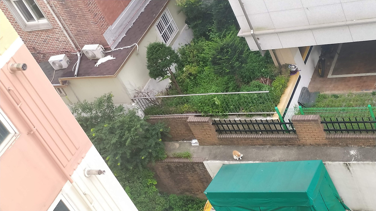 아래 로열층에 자리한 터줏대감은 일면식이 있는 듯 신경도 쓰지 않는다. 자신의 영역을 침범하지 않으면 그만이라는 듯, 녹색 천막 루프탑 위에 벌러덩 누워 꼬리털을 흔들고 핥아 가지런히 정리한다. 등이 간지러운지 먼지 잔뜩 내려앉은 지붕에 누워 부비부비를 하는지 쓱쓱, 걸레질을 하는지 한바탕 난리가 났다.
