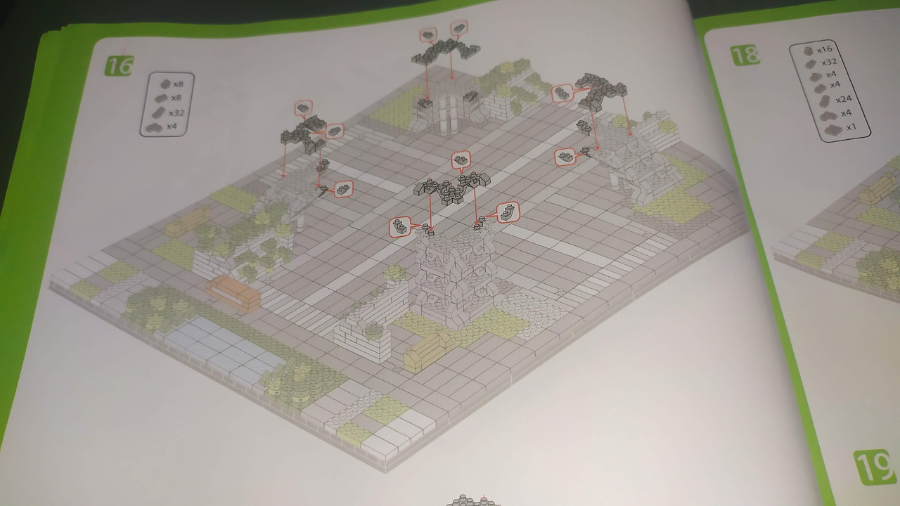 그러다가 오늘, 뜬금없이 애물 취급받는 것들에 대한 글을 쓰면서.. 가까스로 잊힌 이 블록 박스에 시선이 머무르고 마음이 가닿은 것이다. 다시금 박스를 열어 내용물을 확인하고 매뉴얼을 넘겨 보면서 16번에 표시된 경고 플래그에 눈길이 멈췄다. 잠시 고민하다가 페이지를 넘겼다. 꼭 매뉴얼대로 그대로 따라 해야만 성이 차겠니? 이걸 근사한 공간에 전시할 것도 아니고, 누구에게 팔 것도 아닌데 단순히 조립하는 손맛을 느낄 목적이라면.. 굳이 매뉴얼과 100%, 완벽히 매칭될 필요가 있을까? 중간에 1, 2단은 원래 매뉴얼과 다르게, 내 의도대로 멋대로 프리하게 조립하면 안 될까 하는.. 이른바 유도리라 속되게 표현하는, 융통하고 타협하는 마음이 고개를 들었다. 꼬일 대로 꼬인 16번 언저리 순서를 스킵하고 '20번'부터 다시 도전하기로 했다. 탑의 상단을 먼저 조립해서 밑단의 층고를 얼추 맞춘 후에 결합하면 완성품을 볼 수 있을 것만 같았다.