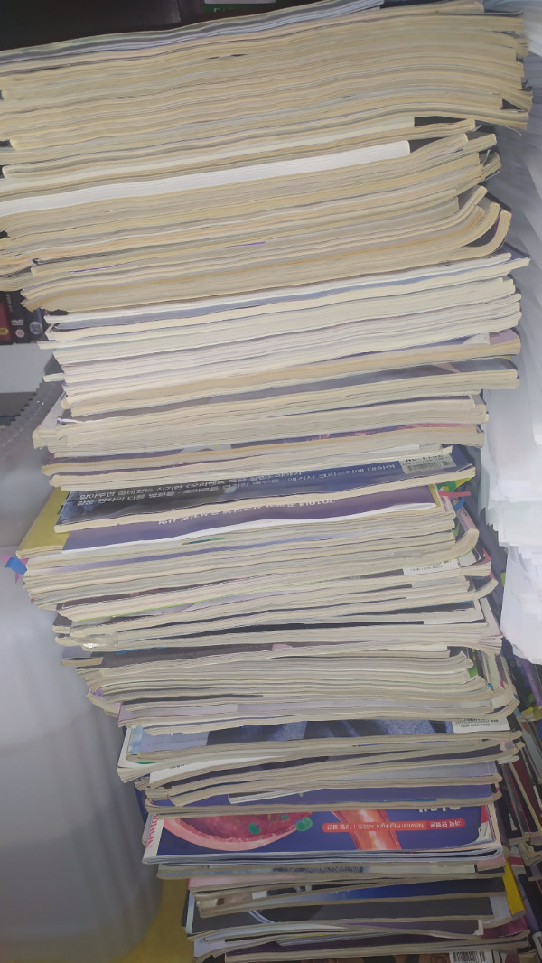 수북이 쌓인 잡지 더미. 습기에 찌들어 쭈글하고 눅눅하다. 그나마 정리한 것이 이 정도 높이다. 그래도 무너지지 않게 잘 쌓았다.