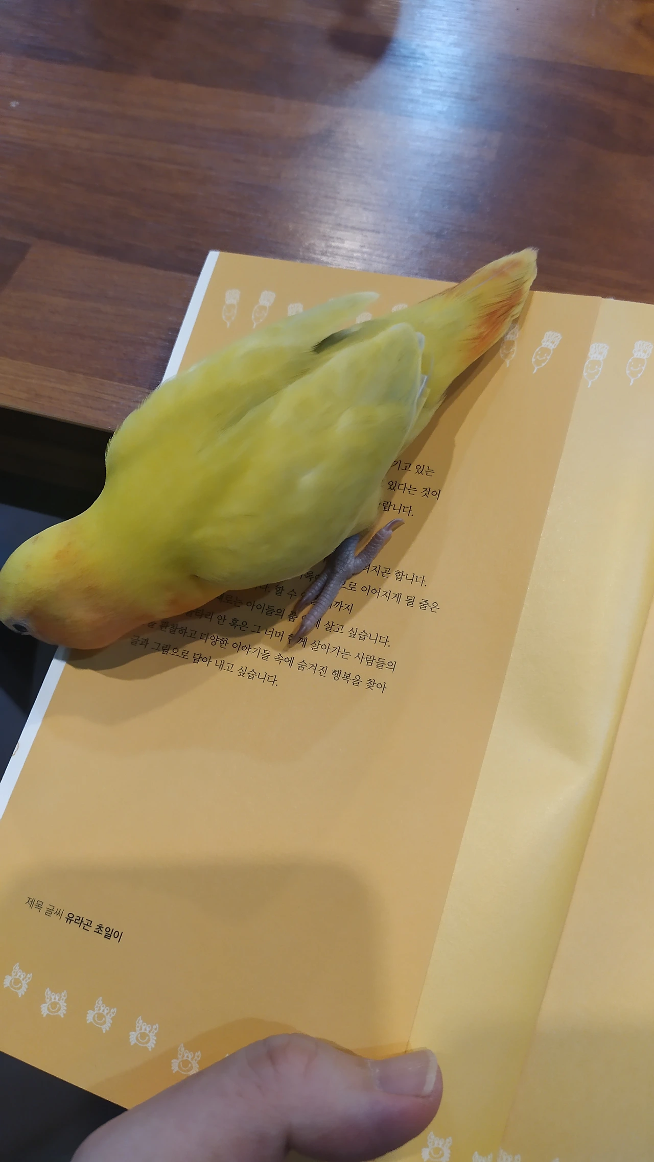 난 마음을 차분히 정리하려 책을 펼쳤지만 앵무새들은 이내 달려들었다. 집에서 돌보는 개냥이처럼 시샘과 질투가 만만치 않은지, 책 표지 위로 올라와서는 책등을 깨물고 쪼고 한바탕 난리를 피우더라. 하는 수없이 책장을 덮고 폰을 열었지만 녀석들은 내가 손에 쥔 것에 집착하며 액정 위로 껑충, 날아올라 유튜브 영상을 가리더니 고개를 갸웃거리곤 하는 것이었다. 혹여 녀석들이 허연 물똥을 무차별 투하할지 몰라 난 모든 소지품을 내려놓고는 맨손을 들어 보여 주었다. 그제야 앵무새 무리들은 내게서 떨어져 더 이상 관심을 보이지 않았다.