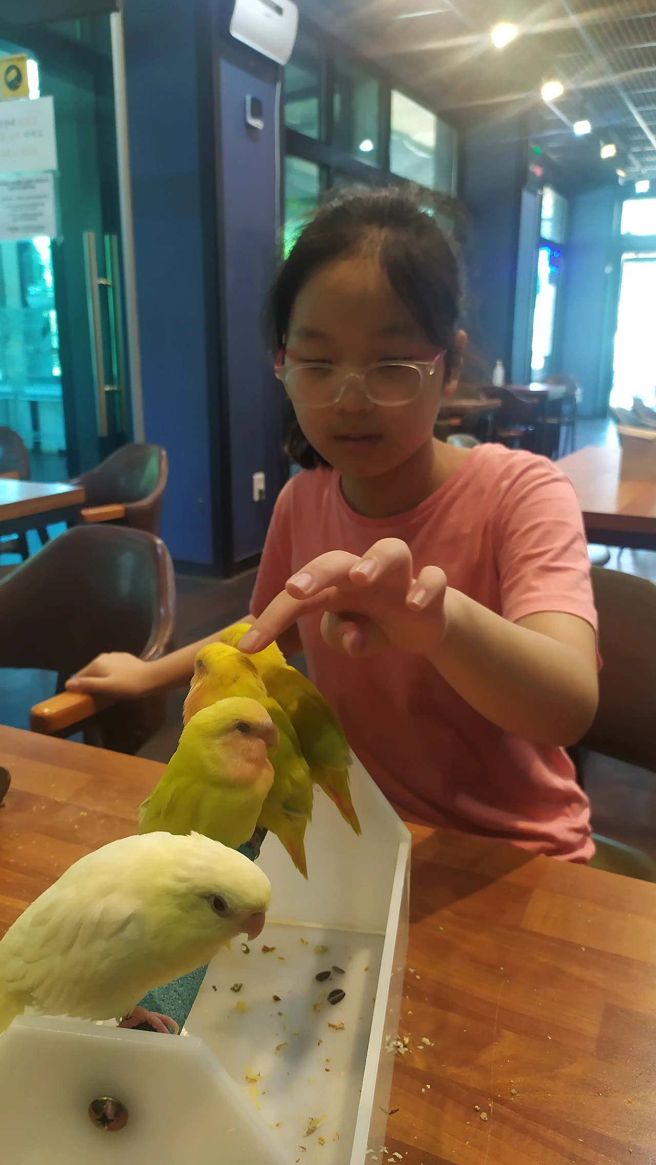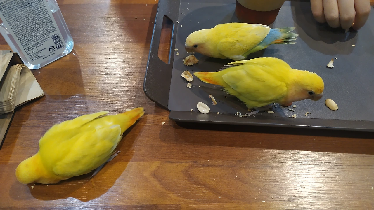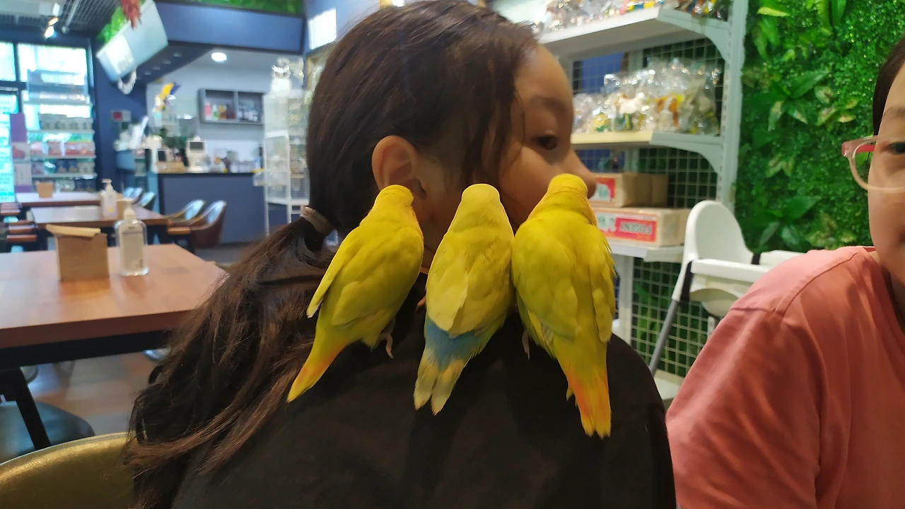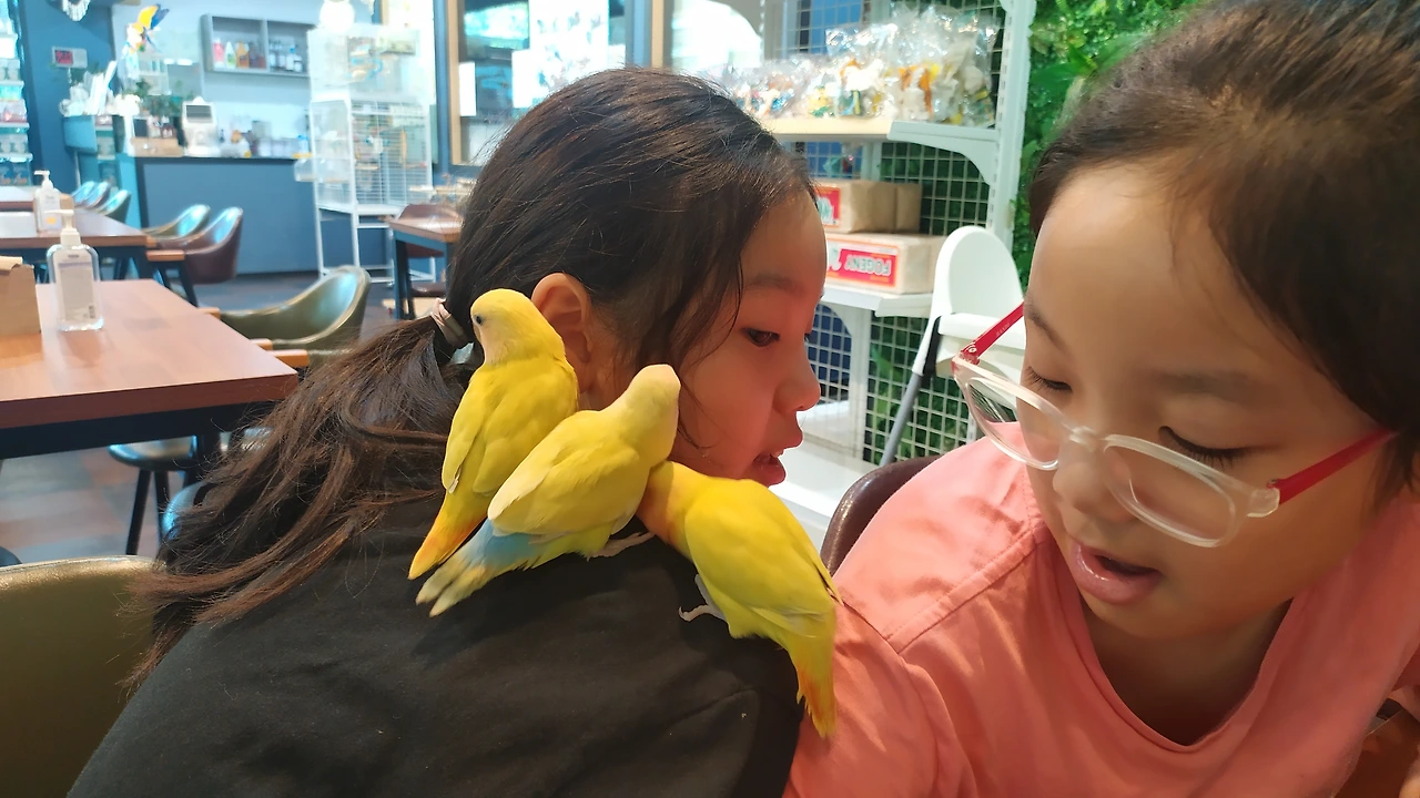 넓은 자리를 골라 앉으니 노랑 앵무새 삼총사가 모이통 횃대에 앉은 채로 탁자 위에 놓인다. 솔이 검지를 가까이 들이미니 한 마리가 주저 없이 올라타더니 팔꿈치를 타고 어깨 위까지 올라가는 게 아닌가. 나머지 두 마리도 냉큼 아이 손목에 올라타더니 재빠른 옆걸음으로 목덜미에 숨어든다.