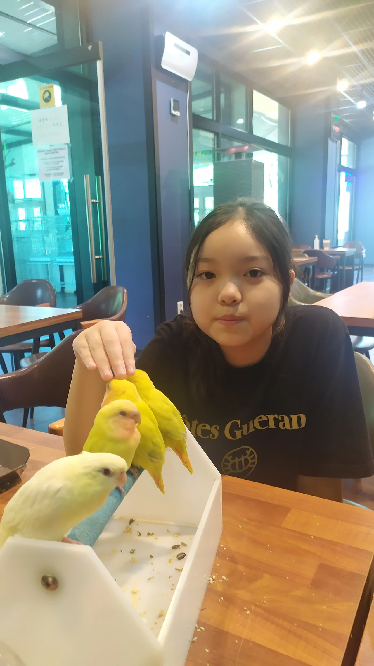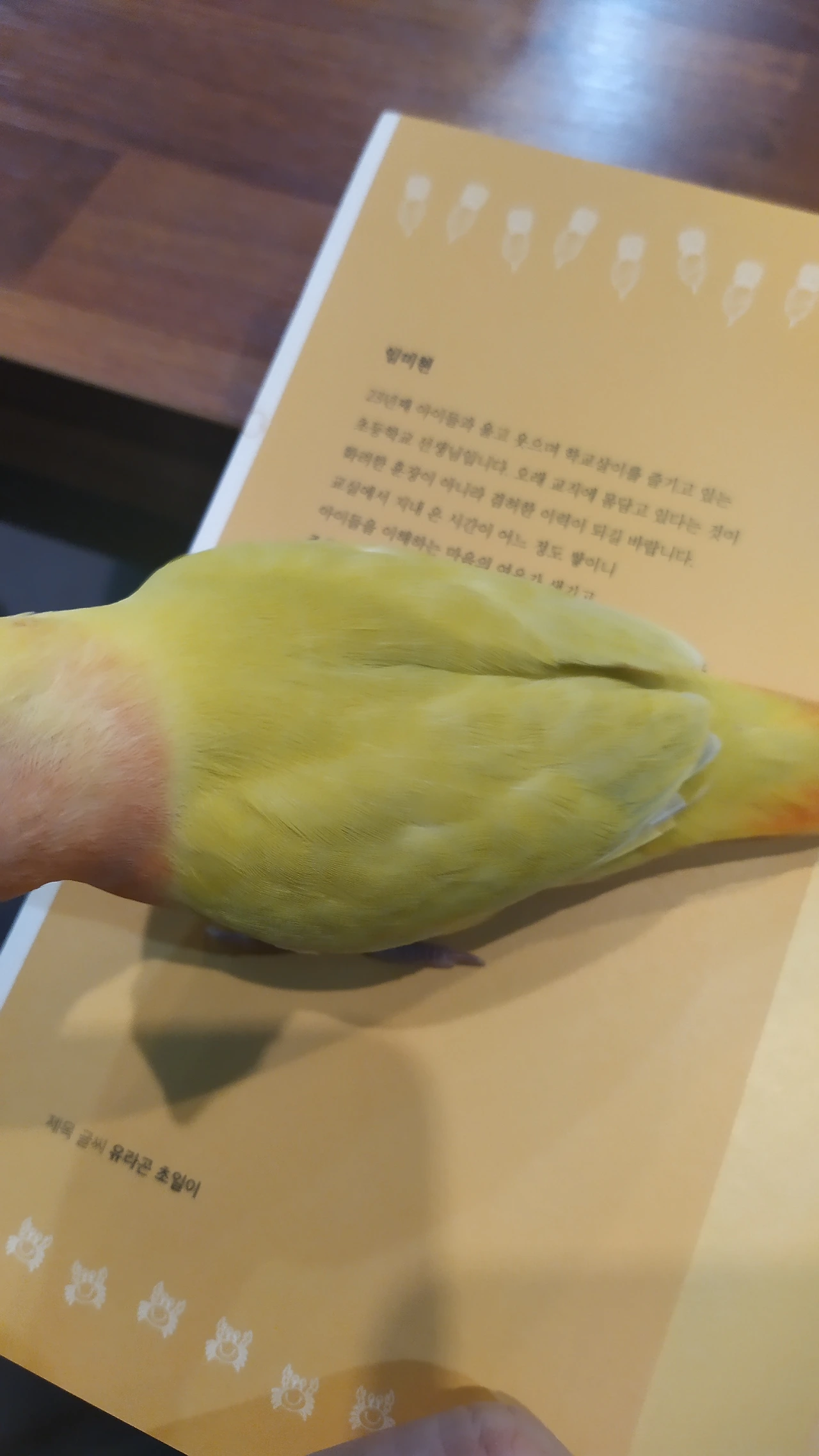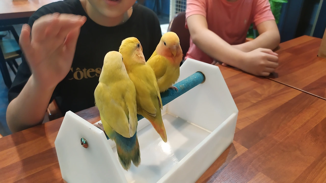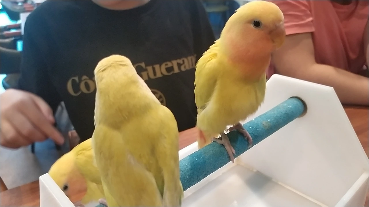 넓은 자리를 골라 앉으니 노랑 앵무새 삼총사가 모이통 횃대에 앉은 채로 탁자 위에 놓인다. 솔이 검지를 가까이 들이미니 한 마리가 주저 없이 올라타더니 팔꿈치를 타고 어깨 위까지 올라가는 게 아닌가. 나머지 두 마리도 냉큼 아이 손목에 올라타더니 재빠른 옆걸음으로 목덜미에 숨어든다.