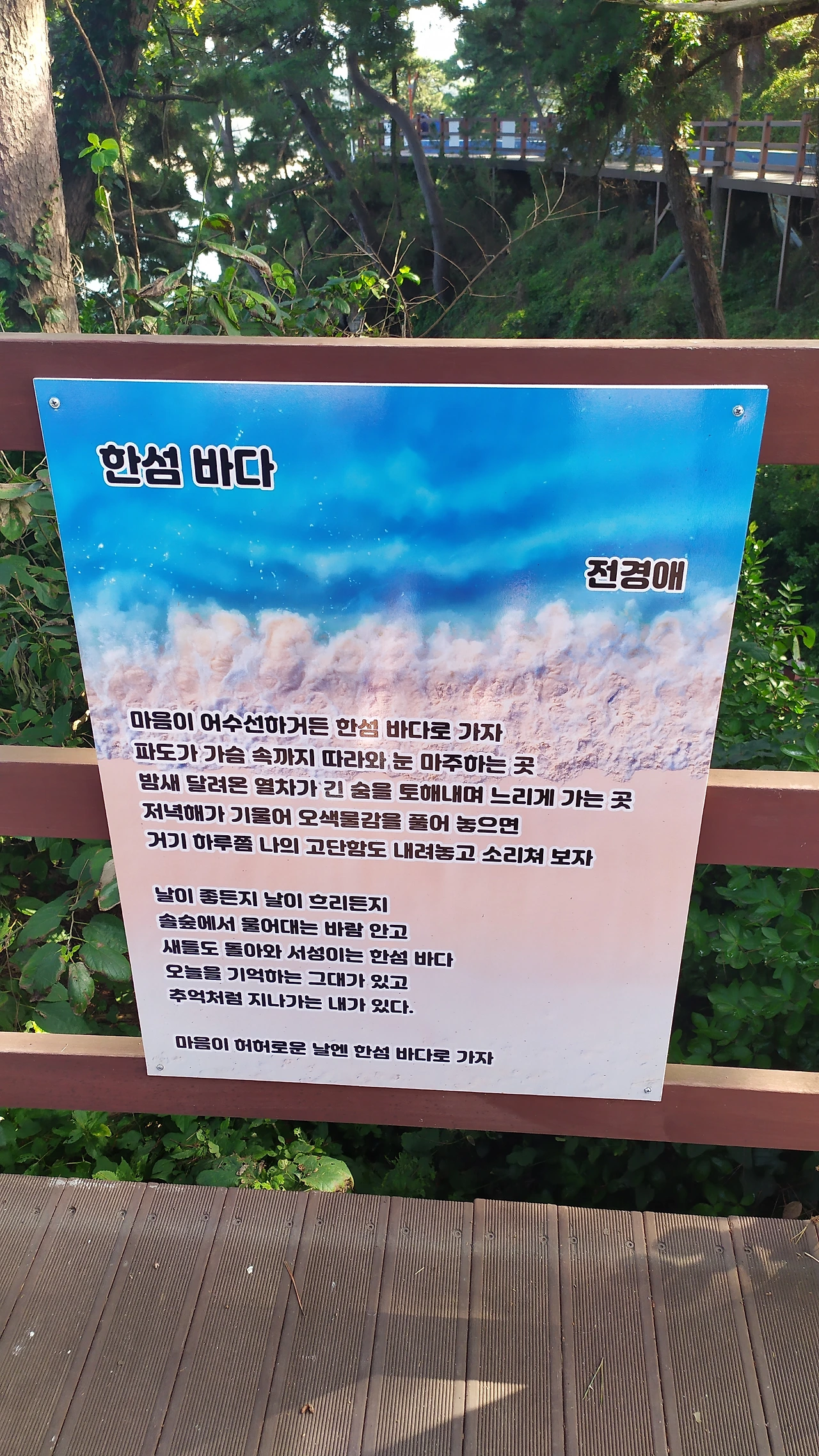 도착하니 해변을 따라 영동선 기찻길이 나란히 달린다. 해수욕을 하다 보면 때때로 경적을 울리며 지나가는 화물 기차가 시선을 끈다. 해변 입구의 편의점을 사이에 두고 양 갈래로 길이 나뉜다. 절벽 위로 올라 고불개 해변으로 향하는 구불한 해안길과 한섬 해변으로 향하는 직선의 나무다리가 보인다. 우리는 평탄한 덱 길로 이어지는 다리를 건넜다.