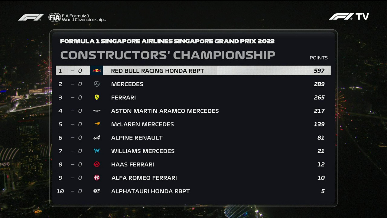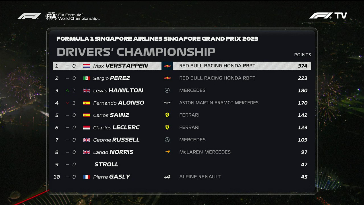 레드불의 베르스타펜은 파이널 5위, 페레즈는 8위로 싱가포르 GP를 마무리했다. 그들은 올 시즌 처음 겪은 패배를 잊고 심기일전하여 다음 GP에 나설 것이다. 오는 일요일 오후 2시에 열리는 일본 스즈카 서킷의 치열한 레이싱을 지켜보기로 하자. 사실상 압도적인 점수 차이로 앞서는 레드불과 베르스타펜이 과연 어느 GP에서 컨스트럭터 & 드라이버 챔피언 타이틀을 획득할 지도, 초유의 관심사가 아닐 수 없다.