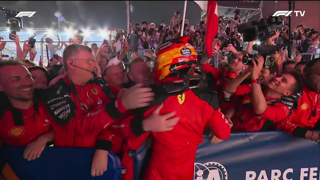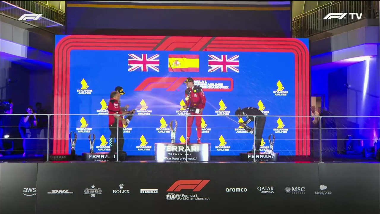 베르스타펜은 한창 추월을 시도하려 기어를 올리는 중에 세이프티 카에 가로막혀 서행을 하고 제자리에 머물러야만 했다. 대세는 그의 편이 아니었다. 싱가포르에 강림한 질주의 신은 레드불과 그의 승승장구를 원하지 않았다. 잠시 후 녹색 기(Green Flag)가 뜨고, F1 레이서들은 리어 윙의 메인 플랩(DRS)을 열어 광속의 막판 질주를 벌인다. 결국 2023 F1 시즌 최초로 싱가포르 GP는 레드불 소속 선수가 아닌, 타 팀의 선수들이 포디엄을 차지하는 진풍경을 연출했다. 페라리의 '카를로스 사인츠'가 폴 포지션 1위를 끝까지 사수하며 최정상에 오르는 감격을 누렸다. 2위는 맥라렌의 랜도 노리스, 남은 한자리는 메르세데스의 루이스 해밀턴이 차지했다. 그들은 흘러넘치는 샴페인을 서로에게 휘뿌리며 기쁨을 만끽했다. 만약 3위를 지키며 앞선 노리스의 꽁무니를 노리던 조지 러셀이 마지막 랩 코너에서 차단벽과 충돌하는 실수를 저지르지 않았다면, 포디엄의 순위는 달라졌으리라.