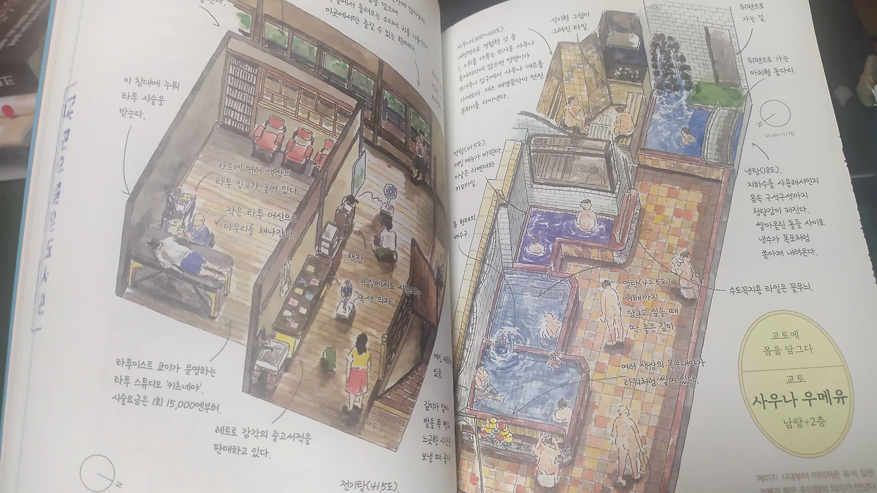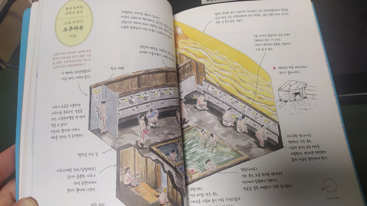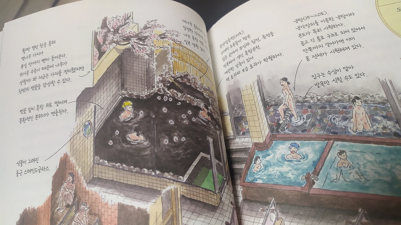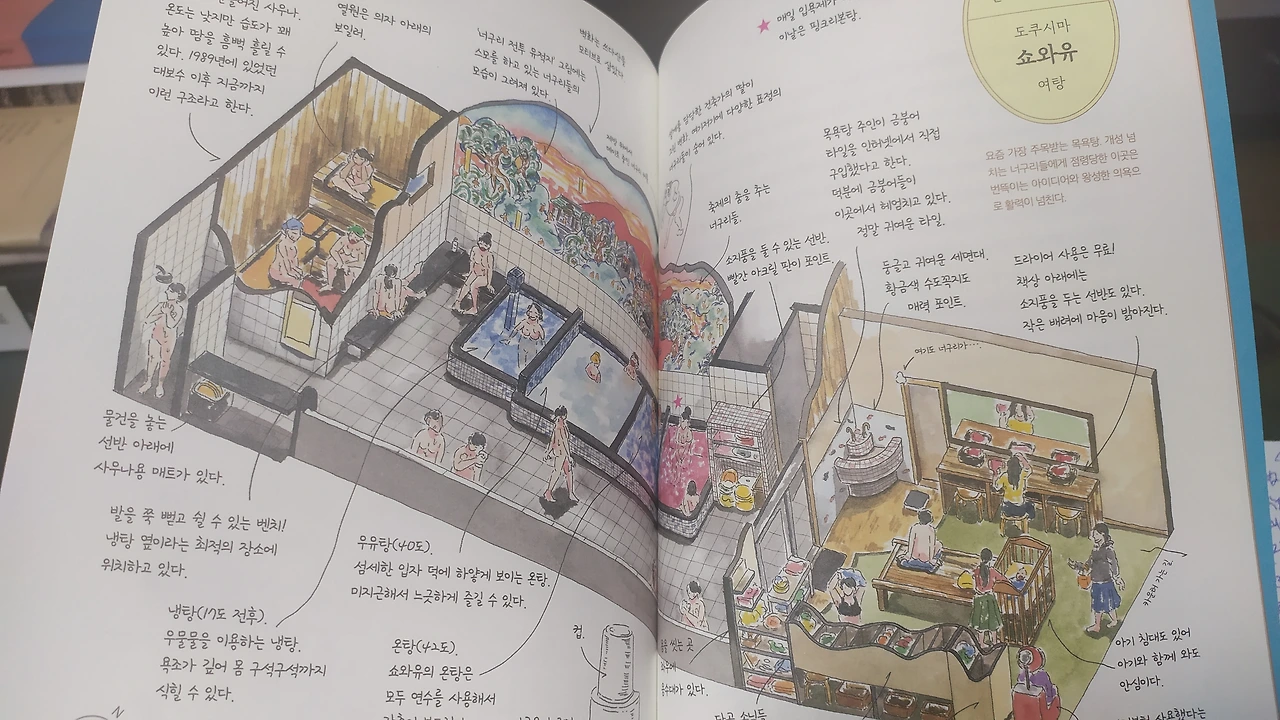 도감에 그려진 수많은 인물들은 각자의 장소와 상황에 맞추어 목욕을 즐기고 있다. 진보라 수건을 목에 두르고 입식 샤워를 하고, 가운데 구멍 뚫린 목욕 의자에 앉아 머리를 감는가 하면.. 데리고 온 사내아이의 등을 박박 밀어주는 엄마도 보인다. 욕탕에 누워 하품을 하고 노래를 부르는가 하면, 지인들과 수다를 떠는 동네 이모들도 여럿 눈에 띈다. 이제껏 일본의 온천, 목욕탕 문화와 명소를 다룬 책들이 다수 출간됐지만, 이렇게 목욕을 즐기는 이들의 알몸을 가감 없이 표현하고, 생생한 동작과 표정까지 정밀 묘사한 책은 없었다. 저자는 욕탕의 세부 측정을 마친 후, 실제 목욕을 즐기며 분위기를 누렸다. 오가는 현지 단골들의 행동과 대화를 유심히 관찰했다고 한다. 베일에 가려진 여탕과 남탕의 은밀한 목욕 생활을 엿볼 수 있다는 점에서 이 책은 욕탕 기행서의 새로운 경지를 개척했다고 평할 만하다. 더불어 개성 넘치는 목욕탕을 디자인하고 운영하는 이들의 철학을 살필 수 있다는 점에서 소장가치가 높다고 자평하는 바이다. 휴게실에 설치된 그물침대와 천장을 무대 삼아 상영되는 미디어 아트, 창밖에서 뻗은 벚나무 가지에서 떨어진 벚꽃 잎이 흑탕에 흩뿌리는 욕실 연출 아이디어는 국내 목욕탕 관계자들도 벤치마킹할 필요가 있다.