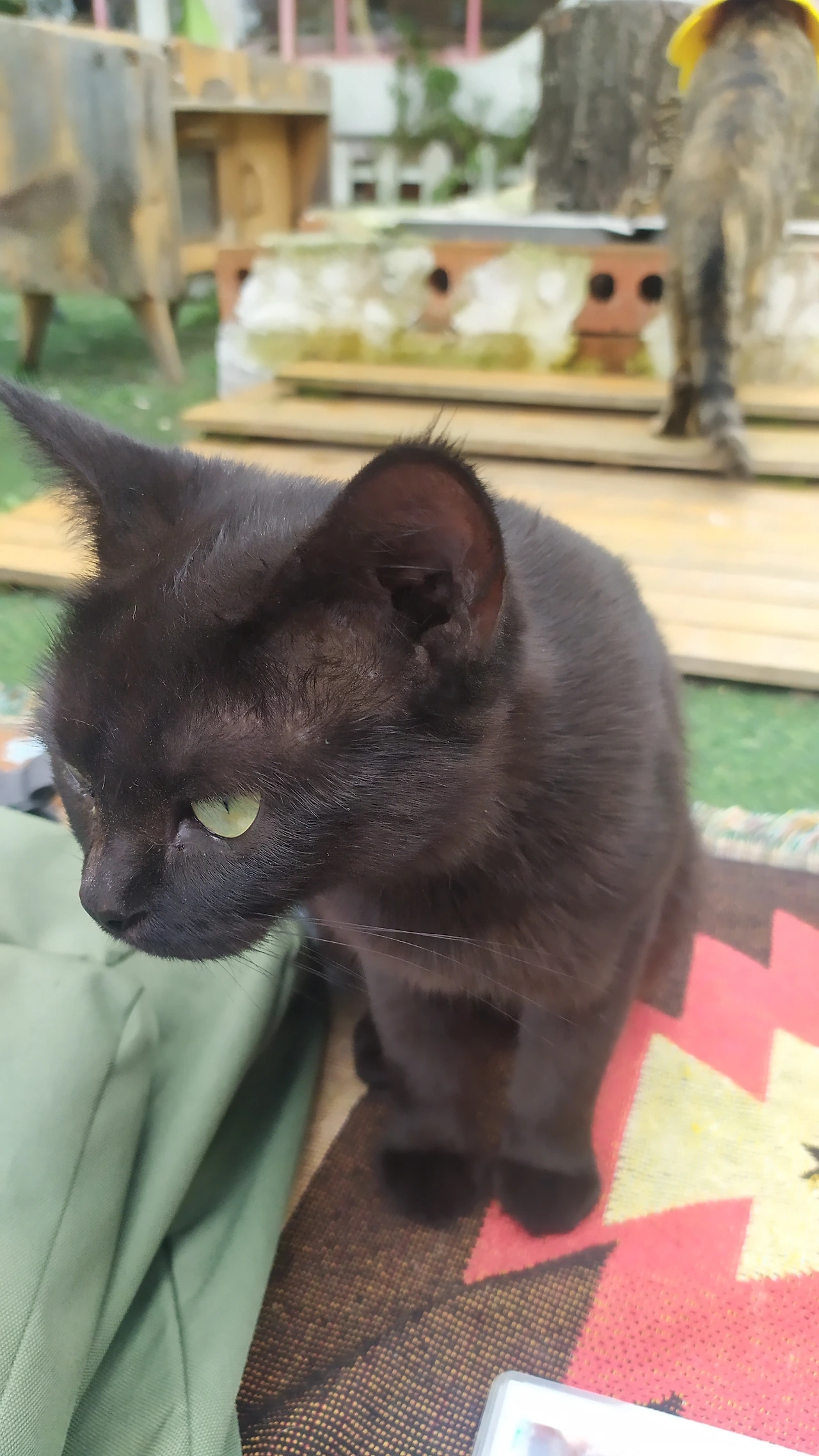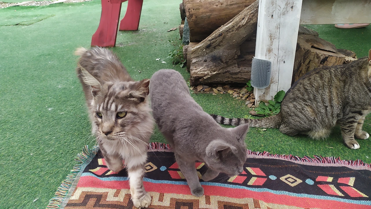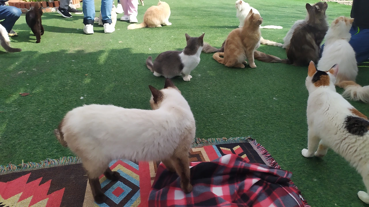 출발할 당시 서울 인근에는 쌀쌀맞은 비가 내렸지만, 여기는 날씨가 화창하다. 하늘도 푸르고 바람도 세차게 불지 않는다. 허리를 낮추고 삐걱대는 나무 여닫이문을 밀고 들어가면 인조 잔디가 깔린 넓은 정원이 나타난다. 곳곳을 활보하는 다양한 고양이들이 눈에 띈다. 방문자들은 담요를 깔고 바닥에 앉아 다가온 냥이들에게 간식을 먹이고 있다. 다행히 이전에 찾았을 때처럼 빈자리를 찾기 어려울 정도로 붐비지는 않는다.