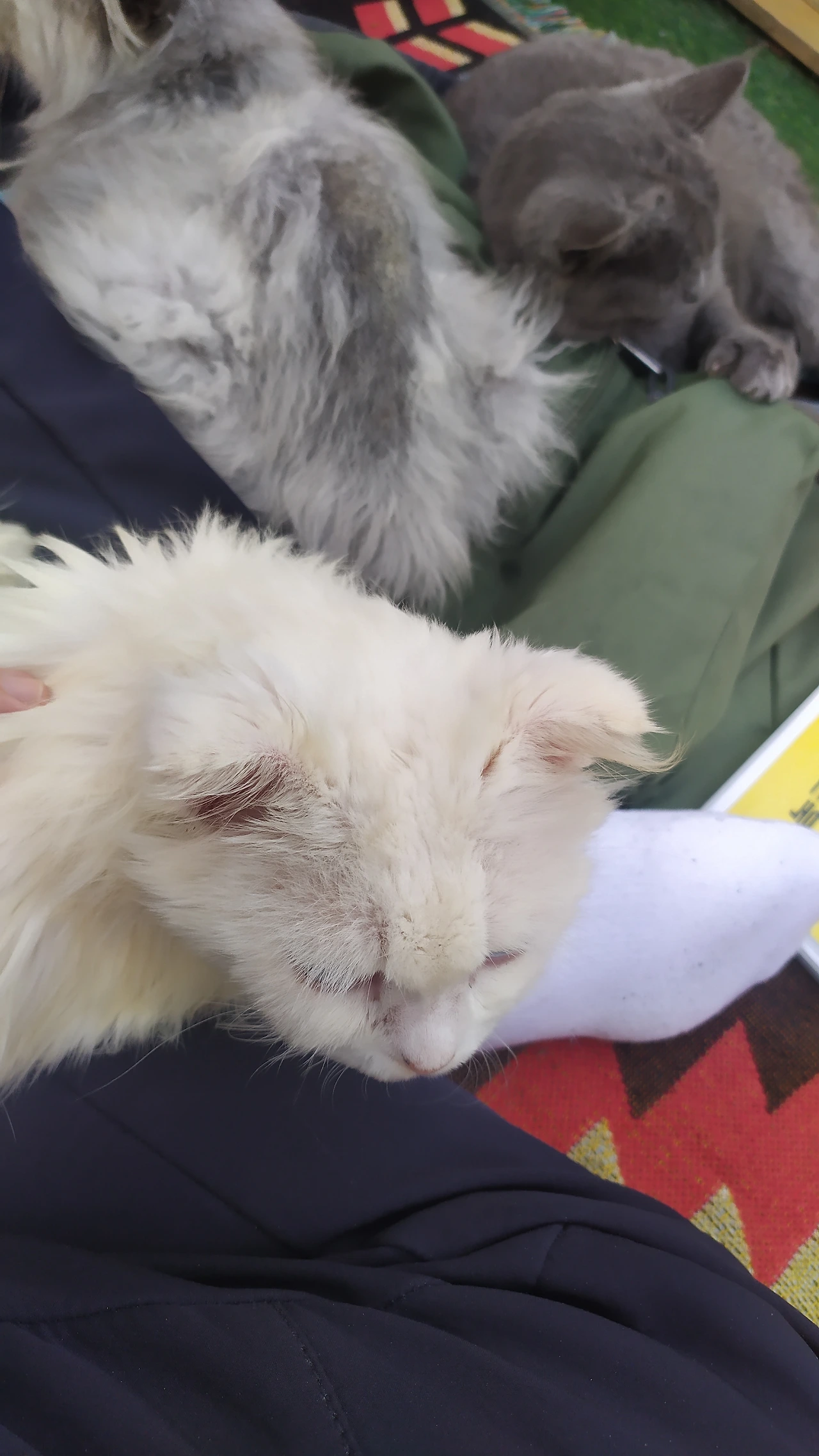 도로를 건너다 차에 치여 불구가 된 아이들이 눈에 띈다. 한쪽 발목이 꺾이고 척추가 골절되어 어긋나 평생 불구로 살아가야 하는 냥이들. 걸음걸이가 부자연스럽고 절뚝거리는 그들이 안쓰럽다. 동작이 느려서 항상 남들보다 뒤처지기에 간식을 줄 때면 먼저 찾아가서 입에 넣어줘야 한다. 부쩍 쌀쌀해진 날씨 탓에 콧물이 줄줄 흐르고, 눈물이 흐르다 눈곱이 겹겹이 낀 아이들이 태반이다. 등을 쓰다듬어도 비틀린 뼈마디의 앙상하고 딱딱한 감촉만이 남아 살갑게 보듬어주지도 못했다. 힘없이 수그린 작은 머리를 쓰다듬고는 추르 간식을 입안에 가득 넣어주었다.