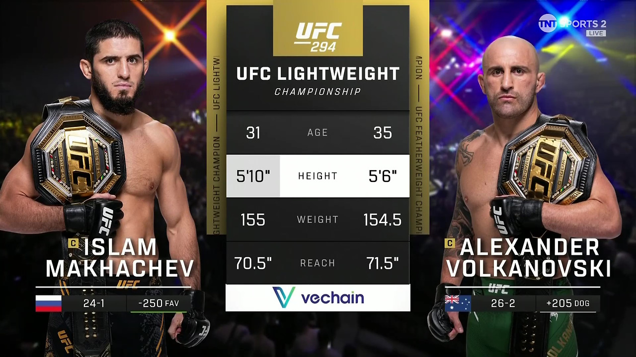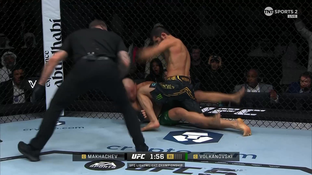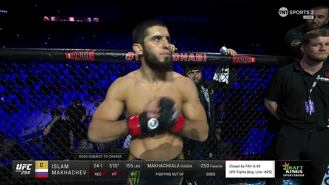 아레나의 열기가 다소 식었나 싶더니, 다시 함성이 끓어오른다. UFC 294의 메인이벤트, 마카체프와 볼카노프스키의 리매치가 곧 벌어진다. 현 라이트 급 챔피언에게 페더급 챔피언이 월장하여 재도전한다. 파운드 포 파운드 랭킹 2위와 3위의 맞대결이다. 원래 마카체프의 상대는 찰스 올리베이라였지만, 스파링 도중 눈자위에 깊은 자상을 입는 바람에 대체 선수로 '볼카노프스키'가 나서게 됐다. 볼카노프스키는 이전 경기 우스만처럼.. 매치를 위한 준비 기간이 부족한, 여러모로 불리한 상황이었음에도 마카체프에게 설욕하기 위해 아부다비행 비행기에 몸을 실었다. 경기 시작 전, 양 선수를 소개하는 해설자의 과장되고 격앙된 목소리가 잦아지자, 두 선수가 다가와 눈빛을 교환한다. 두 선수의 신장 차이가 꽤 크다. 마카체프가 볼카노프스키를 내려보는 상황. 대신 리치는 '볼카'가 약간 더 길기 때문에 이 매치는 붙어봐야 우열을 가릴 수 있으리라.