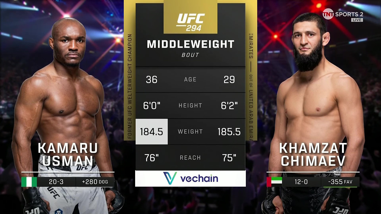 사전 경기를 마치고 Co-main 미들급 매치가 소개된다. 나이지리아의 악몽 '카마루 우스만'과 러시아 체첸의 늑대 '함자트 치마예프'가 맞붙었다. 애초에 치마예프의 매치 상대는 '파울로 코스타'였다. 허나 상대가 팔꿈치를 수술했음을 밝히면서 우스만이 대체 선수로 나서게 됐다. 우스만과 치마예프는 둘 다 웰터급으로 각각 1위, 4위 랭커이지만, 미들급으로 월장하여 타이틀에 도전한 것이다. 카마루 우스만은 현재 파운드 포 파운드 랭킹 7위에 오른, 전 웰터급 챔피언이다. 치마예프는 12승 무패, 6연승을 질주 중이다.