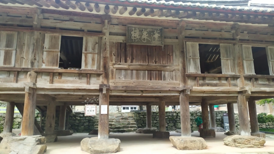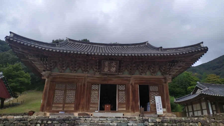 대웅보전 앞을 지키는 봉래루. 모난 반석 위에 올려진 나무 기둥이 듬직하다.