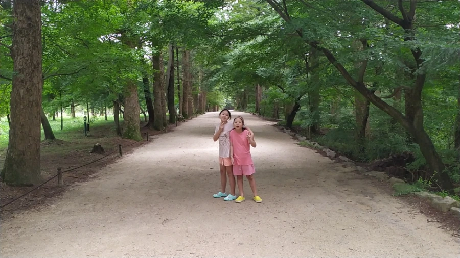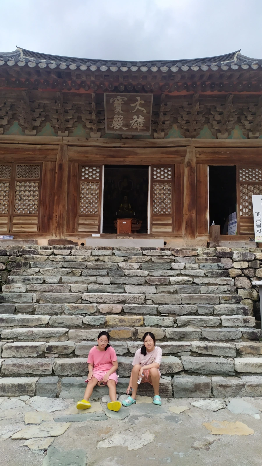 다소 지친 아이들이 대웅보전 앞 계단에 주저앉았다