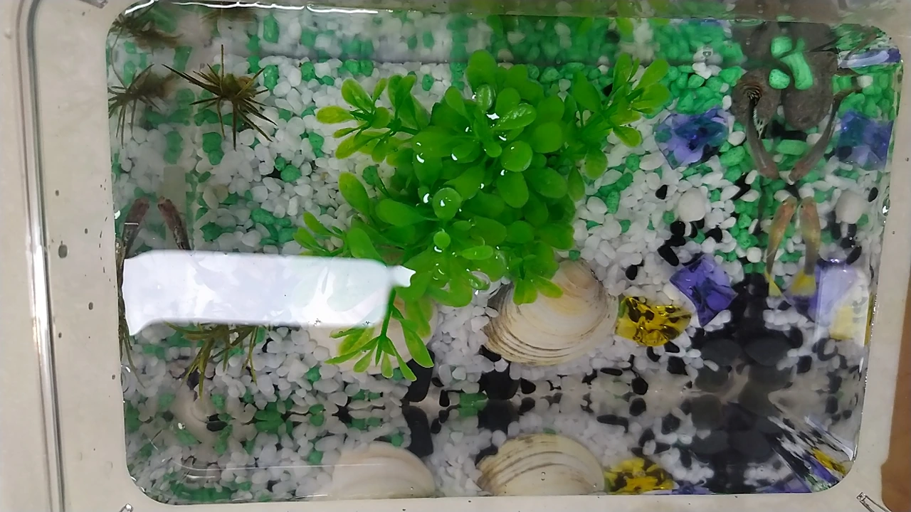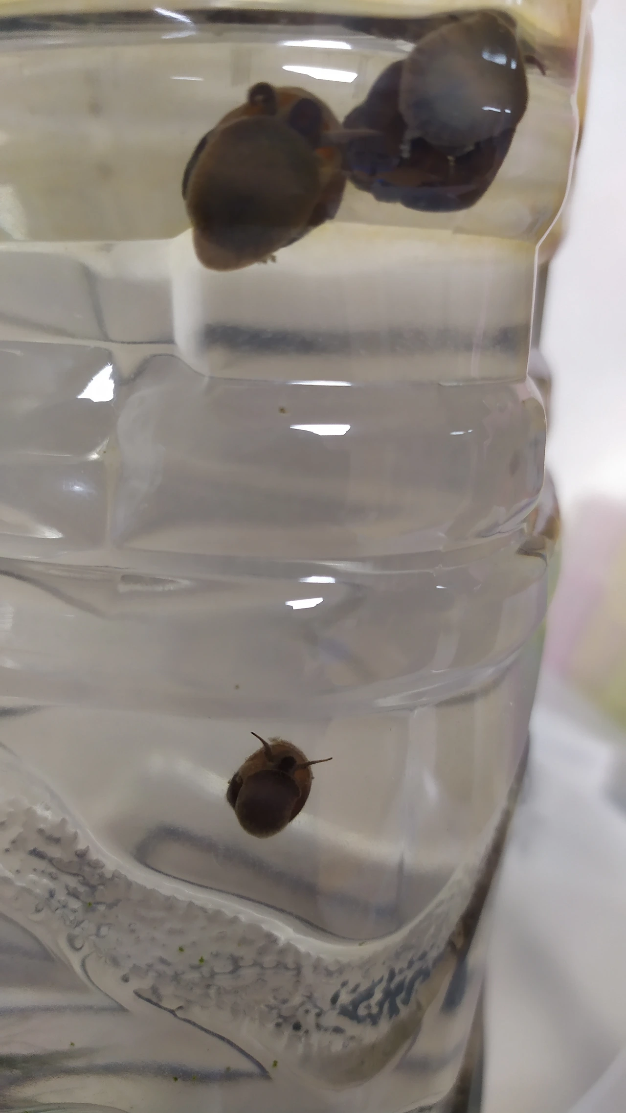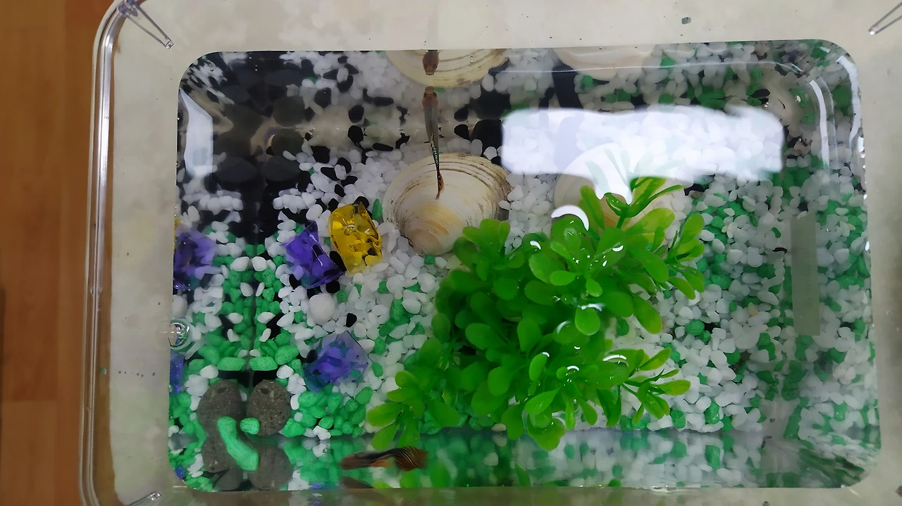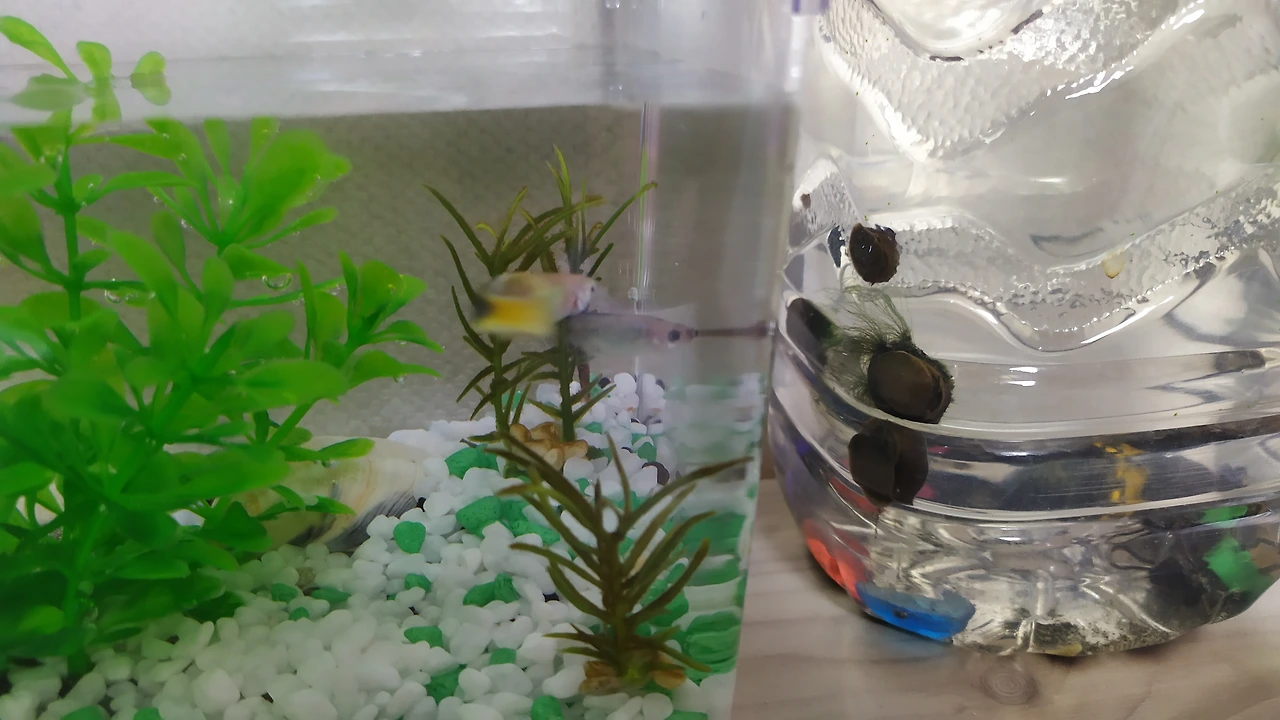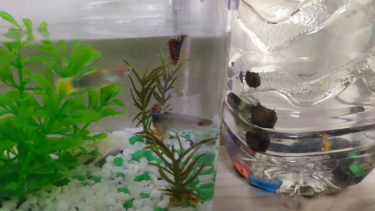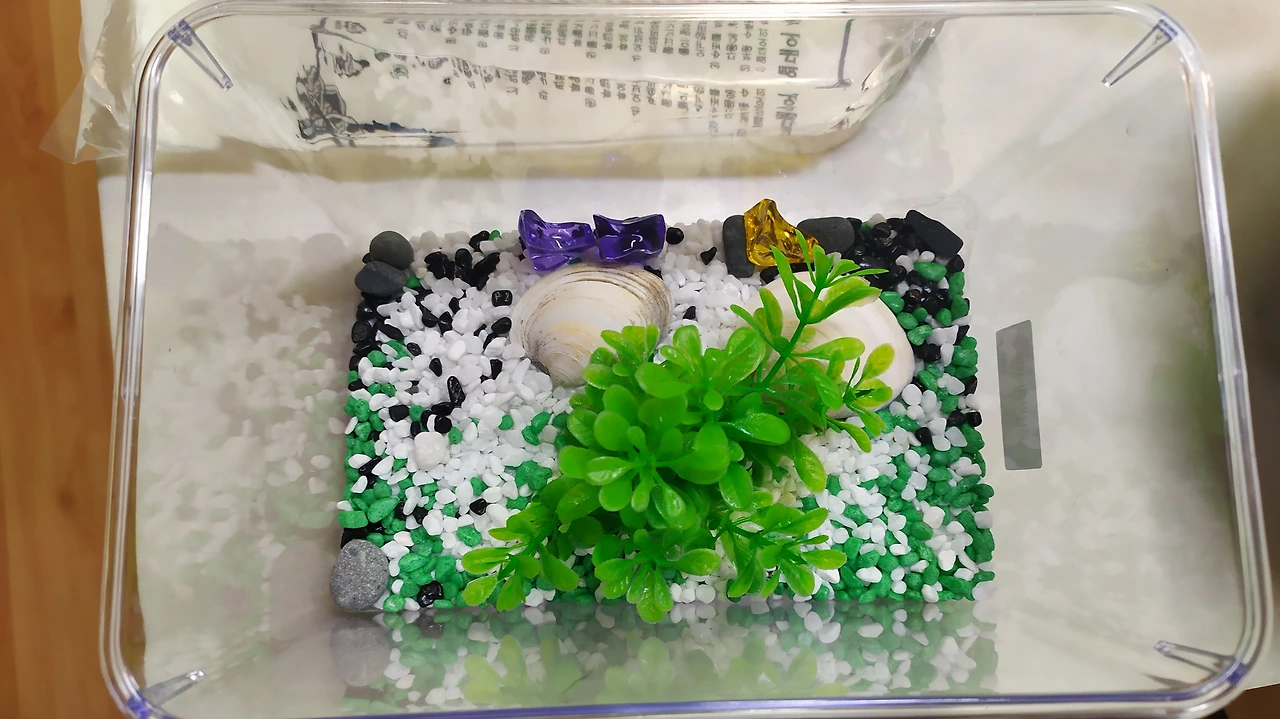 기존에 자리를 지키던 우렁이들은 이제 '10마리'로 늘어났어요. 이제 2리터 페트병 외벽에 달라붙은 자그마한 우렁 새끼들을 찾아볼 수 있어요. 물을 자주 갈아주고 상추가 아닌 다른 가루밥에도 적응하면서 가족들이 불어났네요. 이 친구들은 무던한 성격에 건강 체질이라 수돗물을 바로 갈아주어도 비실대지 않고, 수질에 적응하는 애들이랍니다. 우리나라 수돗물이 그만큼 깨끗해서 그런지 모르겠어요. 나중에 구피들이 새로운 환경에 적응하면 우렁이 두세 마리를 넣어줄까 해요. 우렁이는 타고난 청소부라 어항 벽에 낀 이끼라든지 불순물을 깨끗이 닦아주거든요. 물생활을 편히 하려면 우렁이들을 잘 대접해 줘야, 반짝거리는 투명한 어항을 유지할 수 있답니다.