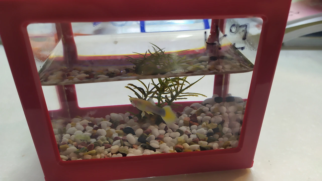 집에 정착해 있던 터줏대감, 엘로우 구피. 원래 한 쌍이었는데 솔이 기르던 구피가 이틀 만에 세상을 하직했다.