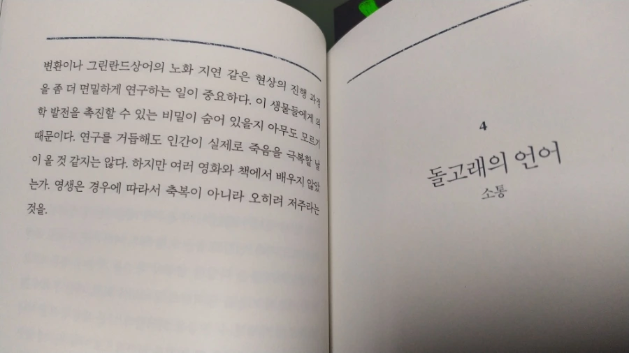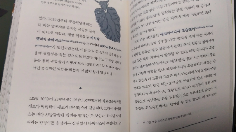 또한 해수면에 서식하는 폰토마이아, 클루니오마리누스 등 이름도 생소한 해양 곤충의 생태와 번식 방법 등을 다루며 앞으로 많은 연구가 필요하다고 주장한다. 개인적으로 마지막 챕터에서 다룬, 바이러스와 미미한 해양 생물들 간의 긴밀하면서 치열한 공생/경쟁 관계가 무척 흥미로웠다. 그들은 서로를 굴복시키거나 협력하는 지난한 과정을 거듭한 끝에 진화하여 이로운 유전자를 취하는 데 성공했다. 끝내 생존한 것들은 시시각각 돌변하는 바다 환경에 적응했다. 인간들은 이들의 기나긴 투쟁과 생존의 몸부림을 목격하고, 주의 깊게 관찰하면서 유전자 가위 이론, 새로운 항바이러스 기법 등을 발견할 수 있었다. 어쩌면 우리를 공포에 떨게 했던 코로나 바이러스의 급격한 유행은 지구상에 존재하는 인류 개체의 폭증과 야만적인 횡포를 견제하기 위해, 전체 생태계의 균형과 평화를 유지하기 위한 나름의 자정 작용이었는지도 모른다.