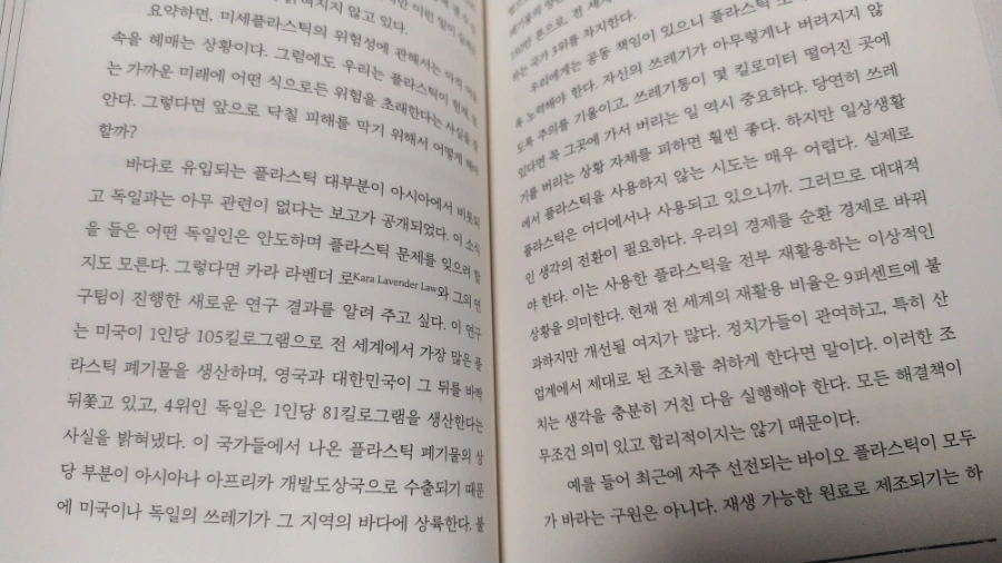 페이지를 넘길수록 흥미진진한 내용들이 가득이다. 바다에 쌓이는 플라스틱 쓰레기의 위험성을 지적하고, 이에 대한 해결책을 제시하기도 한다. 한국은 인근 바다에 누적된 플라스틱 쓰레기 양이 세계 3위권 내에 자리할 정도로 심각한 환경오염 국가이다. 우리는 후세에 청정한 바다를 물려주기 위해 플라스틱 쓰레기를 줄이고, 재활용 비율을 획기적으로 늘리기 위한 노력을 적극 실천해야 한다.