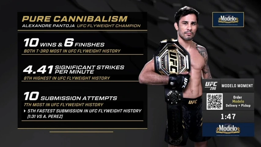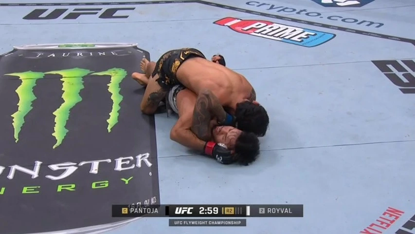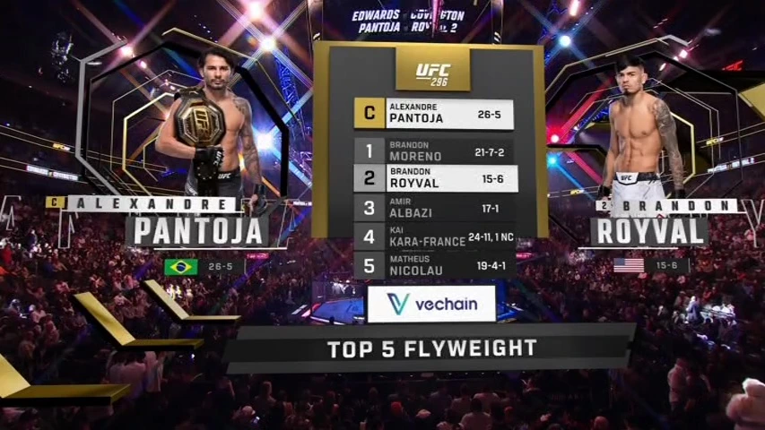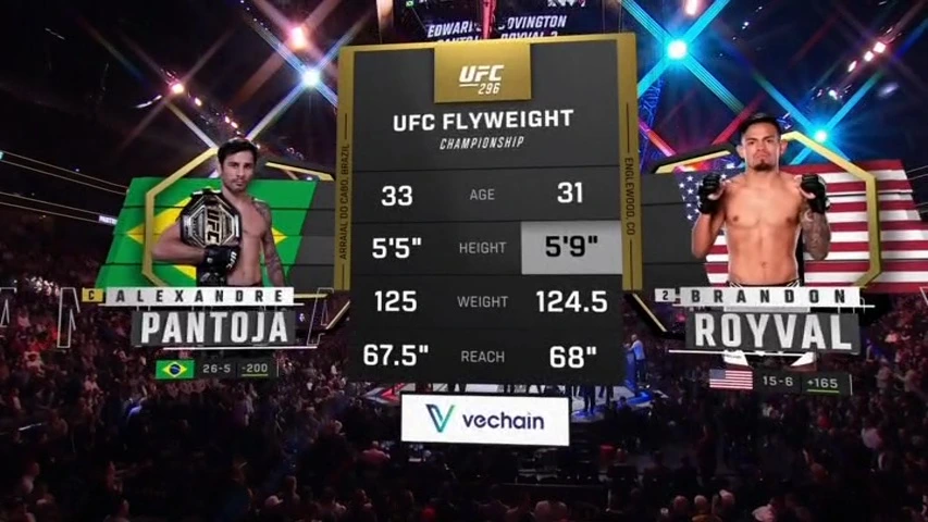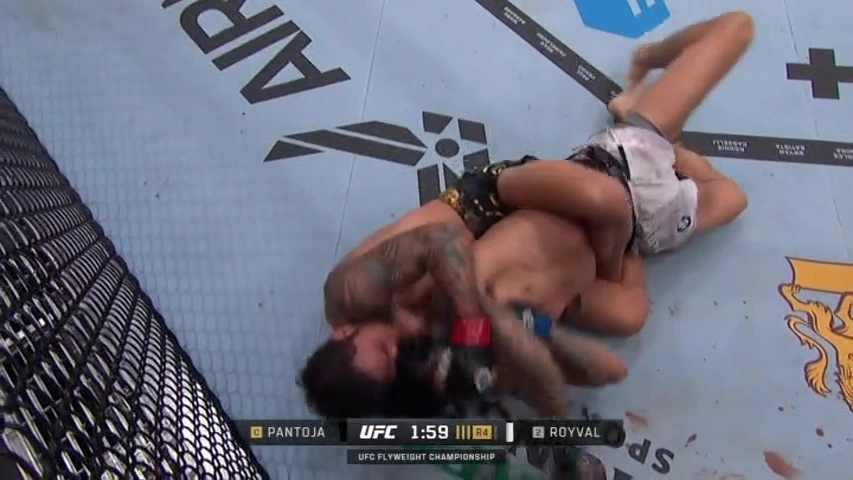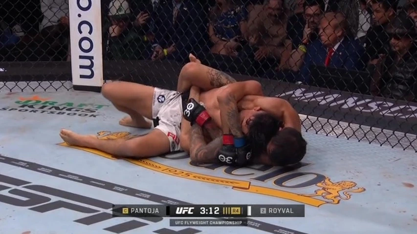 판토자는 UFC 290에서 5라운드 혈투 끝에 전 챔피언 브랜든 모레노를 꺾은 바 있다. 15승 6패를 기록 중인 도전자 로이발은 미국 태생으로 홈팬의 열광적인 응원을 받는다. 경기 초반부터 판토자는 챔프답게 상대를 펜스로 몰아붙이며 연거푸 테이크다운을 얻어낸다. 그라운드에서 우위를 점한 챔프는 로이발을 끝장 내기 위해 파운딩을 내리찍고, 상대의 목을 노린다. 허나 로이발은 끊임없이 팔과 다리를 휘저으며 빈틈을 내주지 않고 응전한다. 4라운드까지 연속 테이크다운을 뺏어내며 도전자를 그라운드에 메다꽂은 판토자는 상대의 강력한 방어 기술 덕분에 피니시를 완성시키지 못했다. 얼핏 보면 그들은 옥타곤 바닥에 누워 서로를 껴안고 열정적인 사랑을 나누는 것처럼 보인다. 한 줌의 애정마저 사라진, 이별을 앞두고 최후의 정사를 벌이는 커플처럼.. 적개심과 증오로 가득 찬 눈빛과 고통에 몸부림치는 표정이 난무하지만 말이다. 5라운드 막판, 지칠 대로 지친 그들은 느린 펀치를 주고받다가 거친 포옹을 하고는 상대를 쓰러뜨리기 위해 안간힘을 쓴다. 챔피언은 우위에 선 그라운드 제어술로 상대를 겁박하며 점수를 획득했다. 결과는 챔피언의 만장일치 판정승. 플라이급 팔각 챔피언 벨트는 여전히 The Cannibal, 판토자의 허리에 둘러져 있다. 대전이 끝난 후, 관중석에 앉아 주먹을 불끈 쥐는 브랜드 모레노가 카메라에 잡힌다. 그는 2024년 2월 AMIR ALBAZI와 매치를 치른다. 이 대전에서 승리하면 판토자와 모레노의 2차 라이벌전이 성사될 가능성이 높아진다.