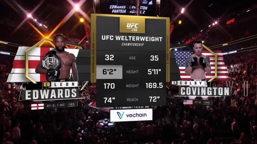 다음 메인이벤트는 2023년 마지막 파이트다. 웰터급 최강자 카마루 우스만을 충격적인 헤드킥으로 혼절시킨, 'Rocky' 레온 에드워즈가 2차 방어전을 치른다. 도전자는 랭킹 3위 콜비 코빙턴. 그는 사전 인터뷰에서 에드워즈의 고인이 된 아버지(그는 살인 사건의 피해자였다)를 언급하며 챔피언을 도발했다. 트럼프는 자신을 열성적으로 지지하는 코빙턴이 에드워즈를 꺾고 승리하면 챔피언 벨트를 직접 둘러 주겠다며 불난 집에 휘발유를 퍼부었다.
