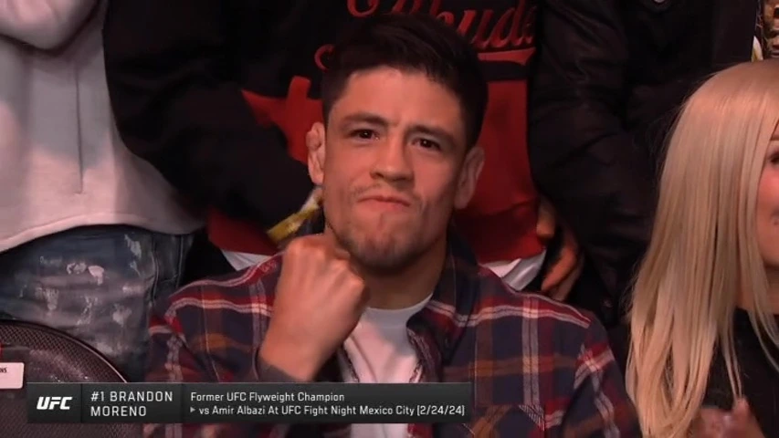 라이벌의 승리를 지켜보는 브랜든 모레노. 주먹을 불끈 쥐며 전의를 다지고 있다
