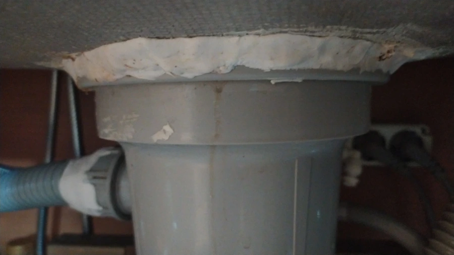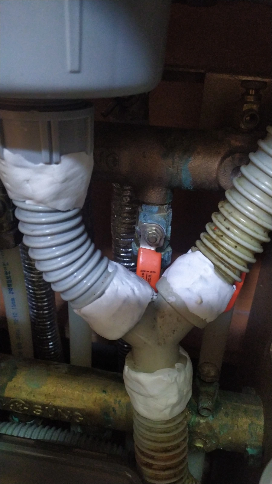 주름관에 묻은 지난 배수 역류의 흔적들. 주름 사이사이 청소할 엄두가 나지 않아 그대로 두었다. 나중에 교체 시기가 되면 새 주름관으로 바꾸려 한다.
