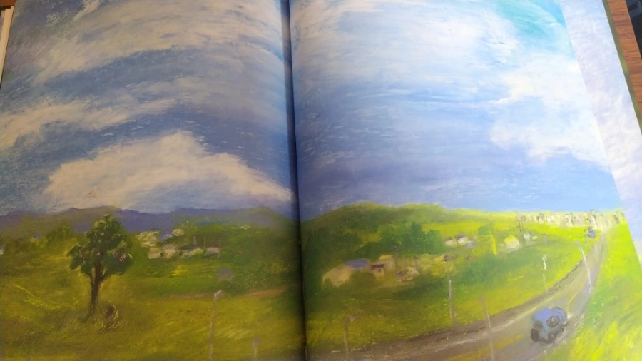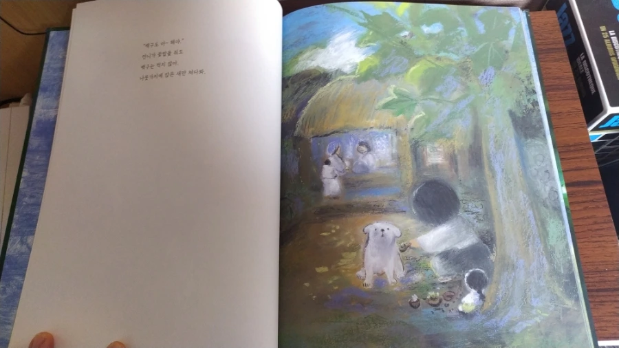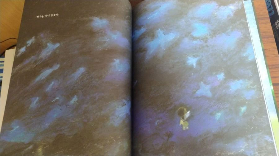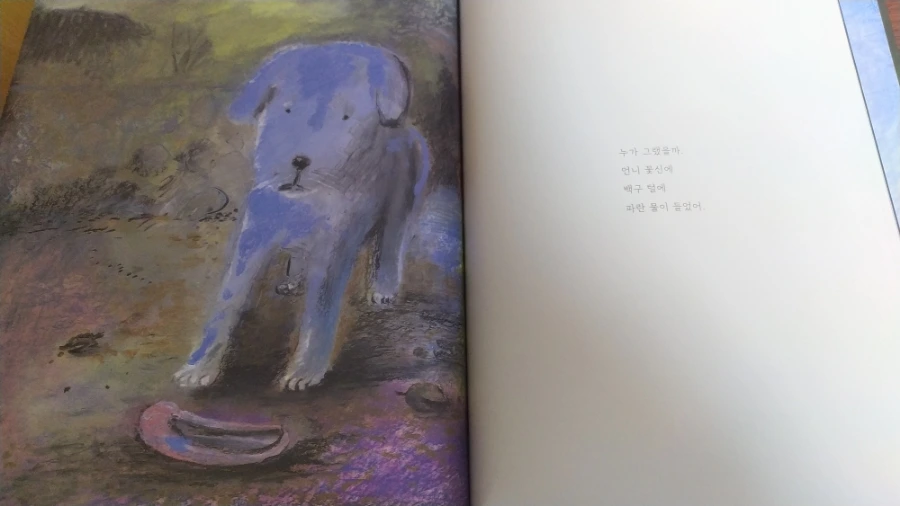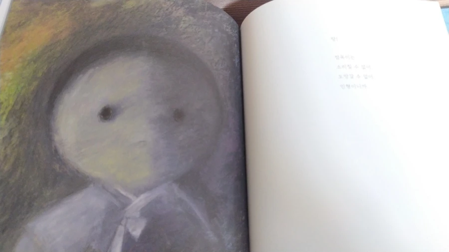 생생히 그려냈다. 오일 파스텔로 두텁게 터치한 그림체가 일견 거칠고 모호해 보이지만, 등장인물들의 표정을 읽는 데는 전혀 모자람이 없다. 철모를 눌러쓴 군인들의 총구 앞에 일렬로 선, 양손을 치켜든 마을 사람들과 어린아이들의 표정이 참극을 예고하는 것처럼 처절하고 애처롭다. 이들 한편에서 서성이는 백구 또한 꼬리를 잔뜩 내리고 기가 죽어있다. 마을 사람들은 빨갱이로 몰려 처형당했지만, 역설적으로 온몸에 파란 페인트를 칠하고 있다.