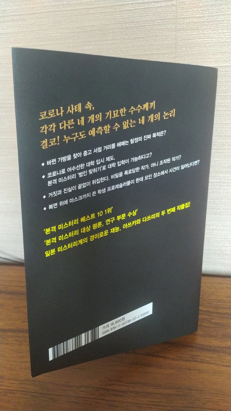 책의 말미 작가 후기에서 소개한 기본 방침대로.. 네 개의 단편은 다양하고 파격적인 구성과 형식으로 짜이되 그 골격은 허술하지 않은, 치밀한 본격 미스터리를 지향한다. 또한 암울한 코로나 시대가 배경이기에 진지하고 딱딱한 내용보다는 유머러스하고 익살스러운 상황을 그렸다.