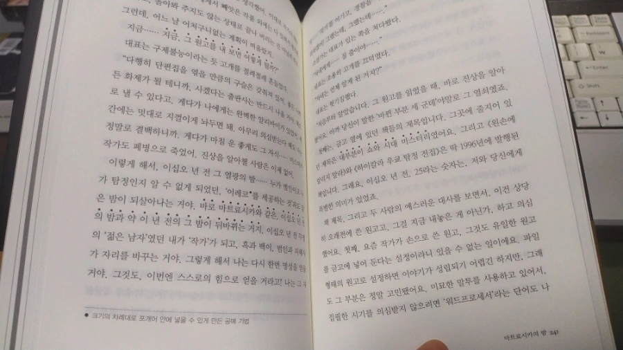 단편에 최적화된 저자의 능수능란한 테크닉은 표제작에서 잘 드러난다. 연극적인 구성의 미스터리 단막극을 연출하면서, 치밀한 논리와 텐션을 시종일관 유지하는 것은 결코 쉬운 일이 아니다. 저자는 무대 위에서 심리전을 펼치는 상대의 허점을 파고들다가는, 이쯤이면 결말이 드러나겠지 하는 시점을 노려 반전에 반전을 거듭 선보인다. 액자 구성을 통해 이야기 속 이야기를 끌어내며, 무한 증식하는 미스터리 물의 '마트료시카 인형'을 꿈꾼다. 시공간을 초월한 평행 우주에서 동일한 범행이 일어나고 범인이 존재하지 않을까 하는 착각마저 불러일으킨다.
