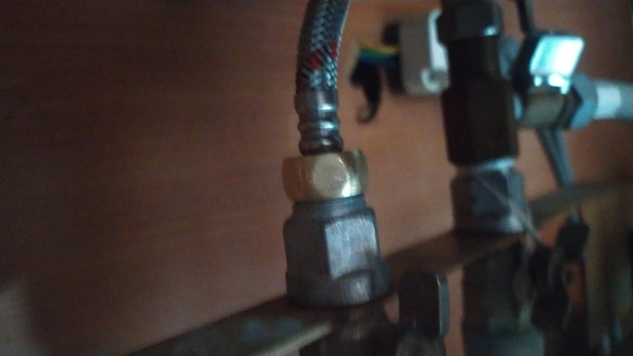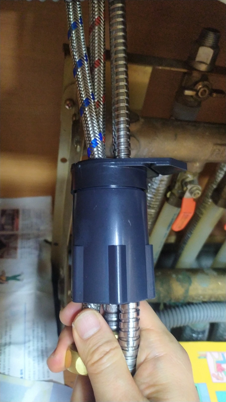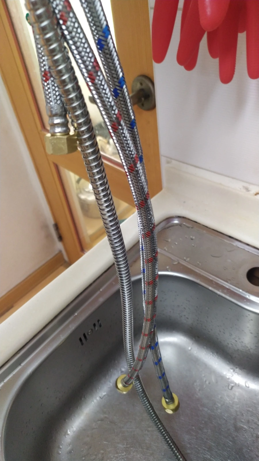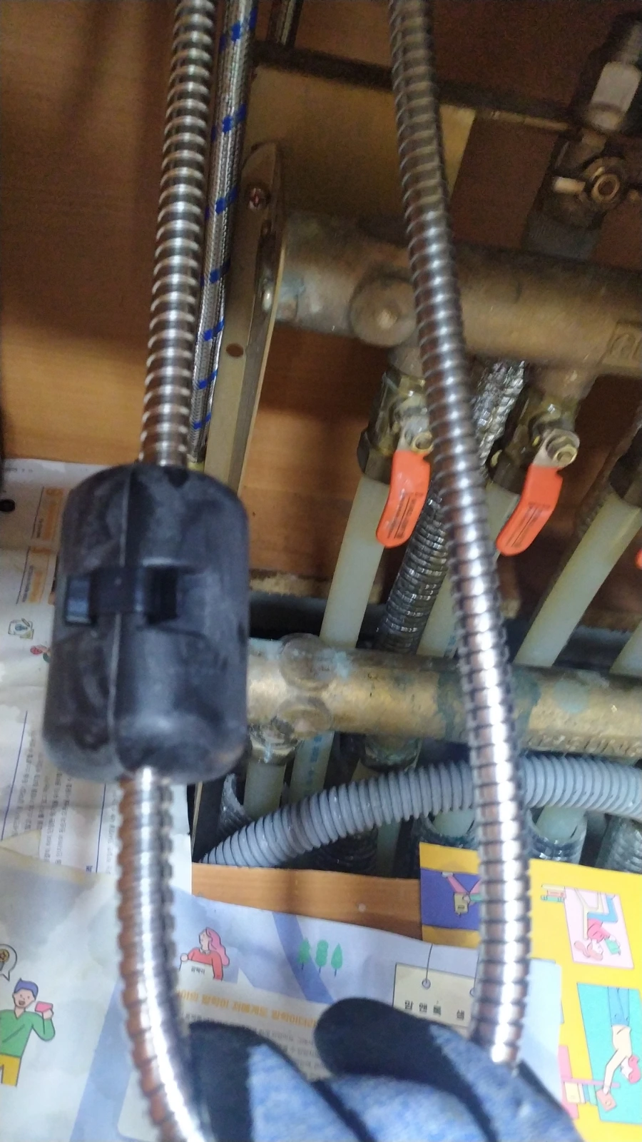 온수와 냉수 호스 체결.. 내부 공간이 협소해서 선 정리에 애를 먹었다.