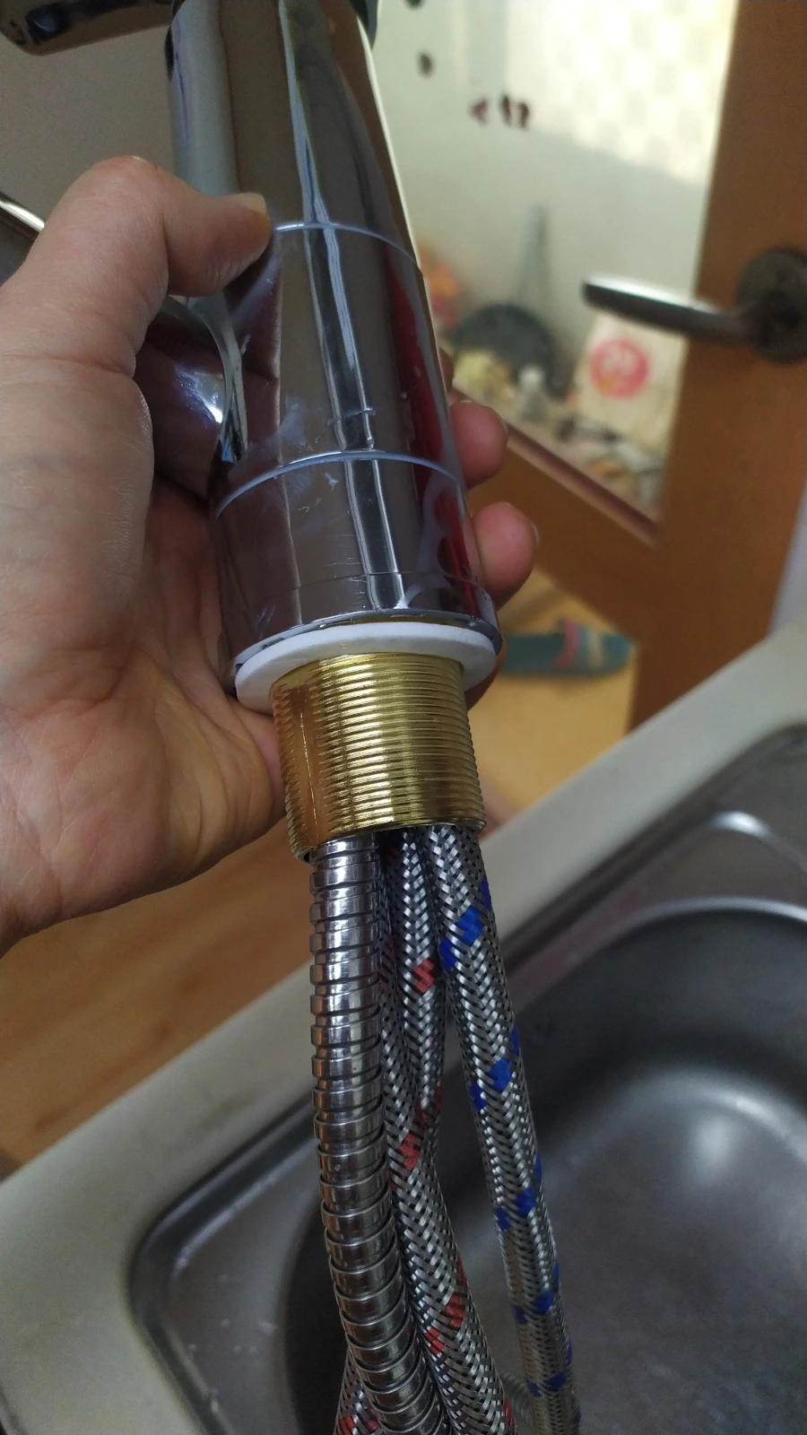 기운 보충을 위해 진한 커피 두세 모금 마시고 새로운 수전을 설치해 봅시다. 설치는 해체와 반대로 싱크대 위에서부터 내려오면서 작업합니다. 혼합 호스가 연결이 되어 있다면 너트를 풀어서 길게 늘어뜨려 줍니다. 본체에 원형 방수 스펀지를 넣어준 후, 네 가닥 라인을 가지런히 정리해서 싱크대 구멍에 차례로 넣어줘요. 허리를 굽혀 아래를 봅시다.