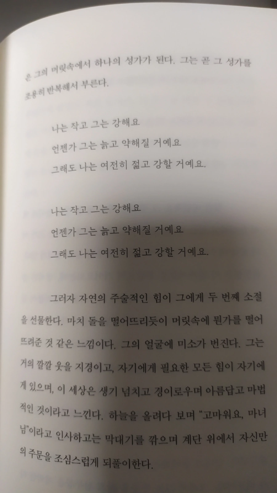 그는 나이가 들었지만 마음은 어린아이의 그것, 동심으로 돌아갔다. 흙더미를 질주하는 개미 무리와 공중을 비행하는 벌들을 쫓으며 그들의 분주한 일상을 추적한다. 정원 곳곳에 흐드러지게 피어나는 제라늄, 라벤더, 라일락, 금강초롱 등 다종다양한 화초들을 보살피면서 자연의 신비함을 깨닫는다. 과거의 유년기를 떠올리며 친부의 폭력에 따른 트라우마에 괴로워하지만, 그에 집착하고 함몰되지는 않는다. 어릴 적 깡통 전화, 백과사전, 들고양이, 민달팽이 등을 다루고 어울리던 추억을 재구성하면서 그 안에 숨은 즐거움, 기쁨, 환희와 같은, 빛나는 감정을 되살리려 노력한다.