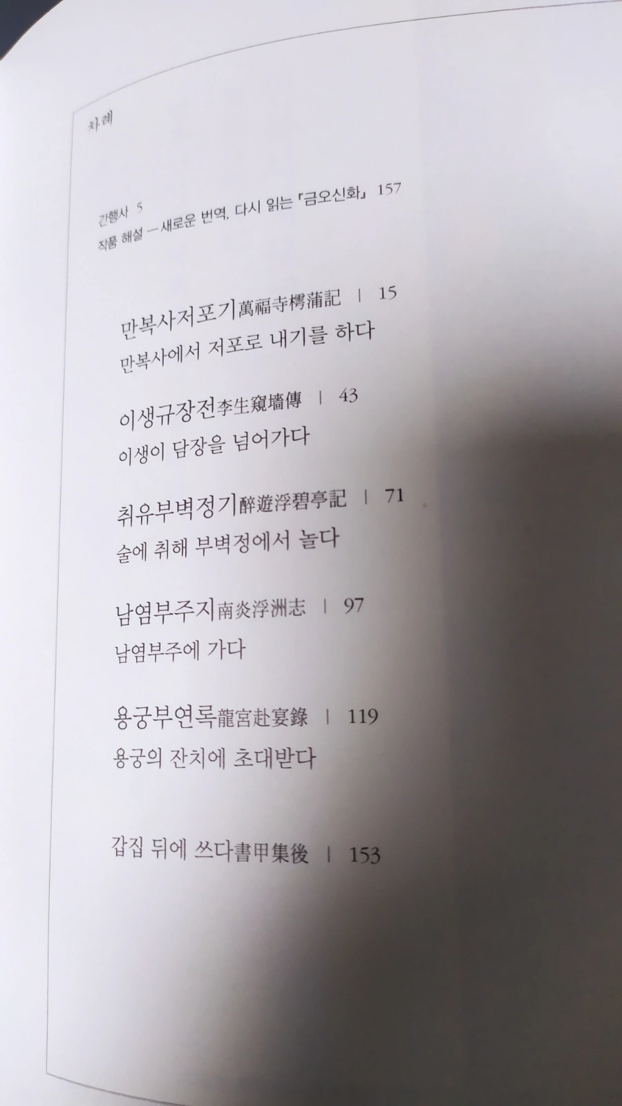 남원에 '양생'이란 자가 이성을 애타도록 찾다가 밤에 등불로 점을 치고, 부처님과 저포(윷놀이) 내기까지 하며 한 여인을 쟁취했으니.. 첫 단편 <만복사저포기>부터 이 세상 사람이 아닌, 억울한 죽음으로 한 맺힌 여인을 만나 정을 통하고 이별을 하는 기담이 펼쳐진다. 시를 읊으며 사랑을 나누던 남녀가 신선, 선녀로 다시 태어난다는 <취유부벽정기>를 지나면 '박생'이란 자가 염라왕과 만나 귀신의 섭리, 군주의 덕목에 대해 거침없이 진담을 주고받는다.