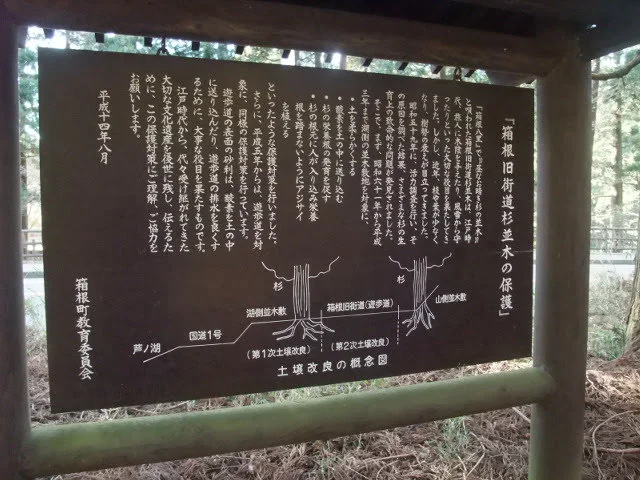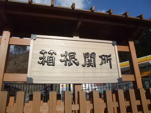 도로 중간에 명판이 새겨진 목조 건물이 보인다. 箱根関所(하코네 세키쇼) 즉 '하코네 관문', 에도 시대 하코네 지역에 설치된 역사적인 검문소라고 한다.