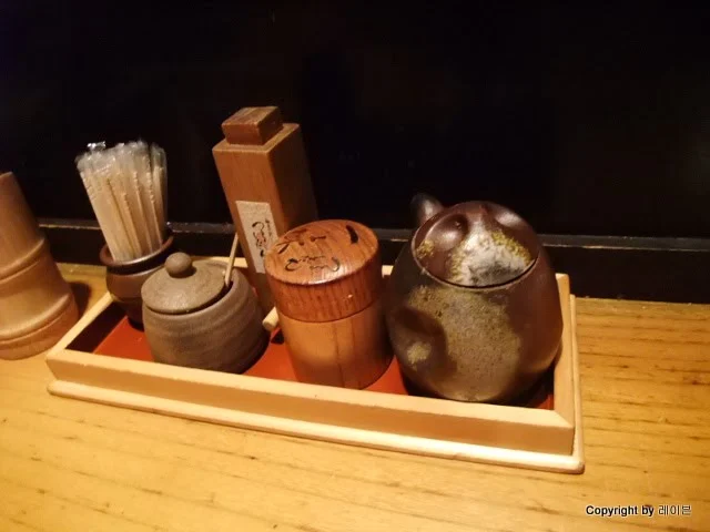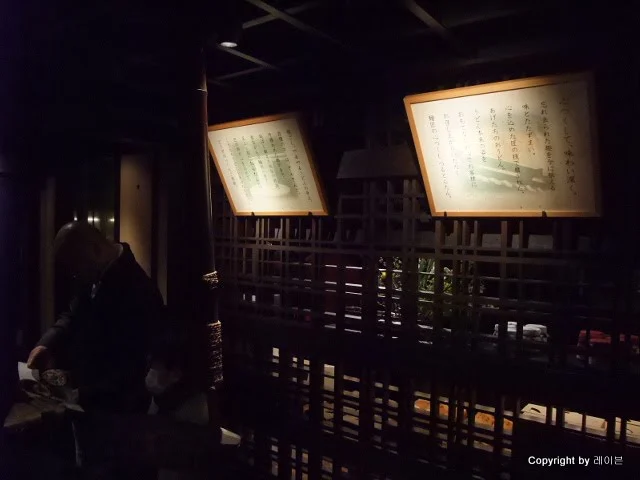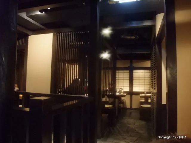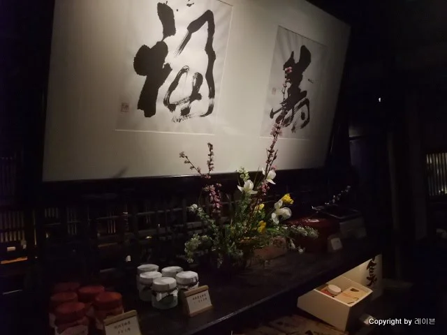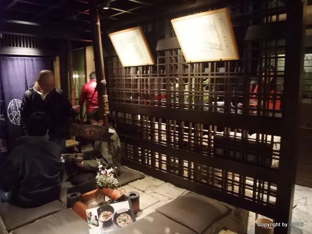 우리는 무거운 캐리어를 끌고 있어 입구에서 가까운 테이블 바에 자리 잡았다. 다소 어두운 분위기의 실내 안쪽에는 나무 창살로 칸막이된 여러 테이블, 액자에 걸린 정갈한 서체로 적힌 경구, 전통 공예품 등이 눈에 띈다.