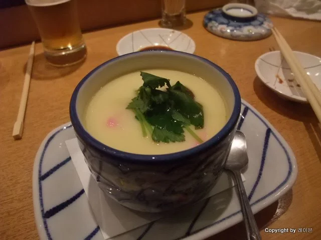 이 스시집 꽤나 만족이었다. 가격도 저렴하고 떠들썩한 시장통 분위기라 활력이 재충전되는 기분이다. 크리미 한 식감의 부들부들한 계란찜. 그 안을 수직으로 파내리면 가리비, 오징어, 문어 같은 해산물 큐브들이 가득이다. 오사카는 생선, 대게, 문어, 조개 등 싱싱한 해산물이 풍족한 항구도시였다. 계란찜 위에 고수를 올렸는데, 밑접시에 덜어놓고 느끼함이 못 견딜 때쯤 한 잎 맛을 보면 입안을 깨끗이 초기화, 정리시켜 준다.