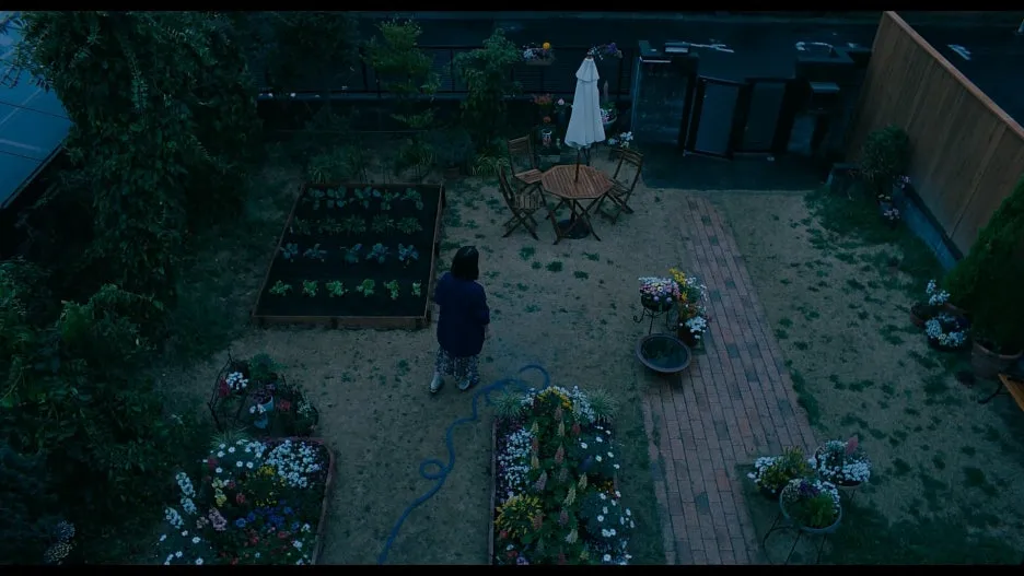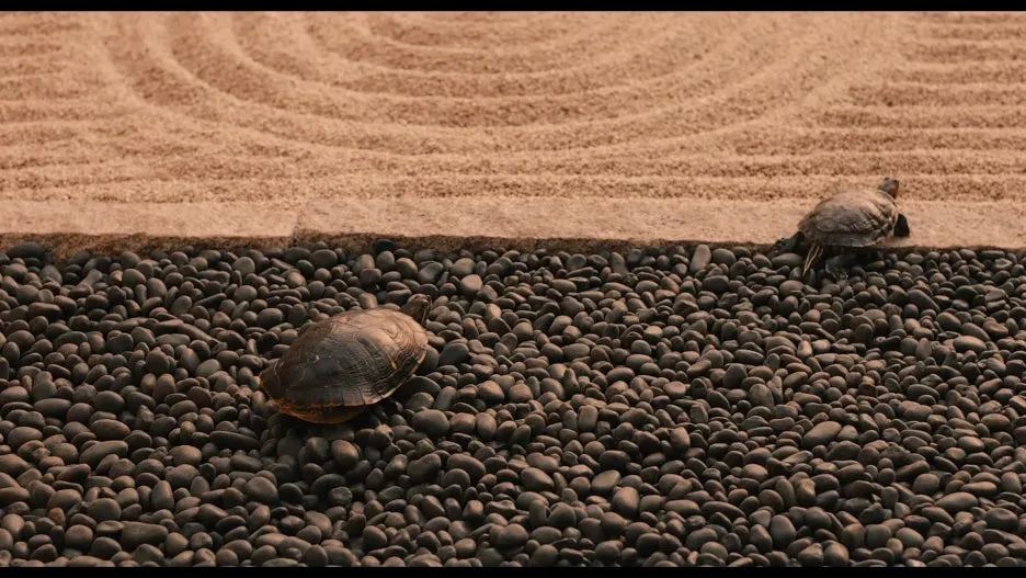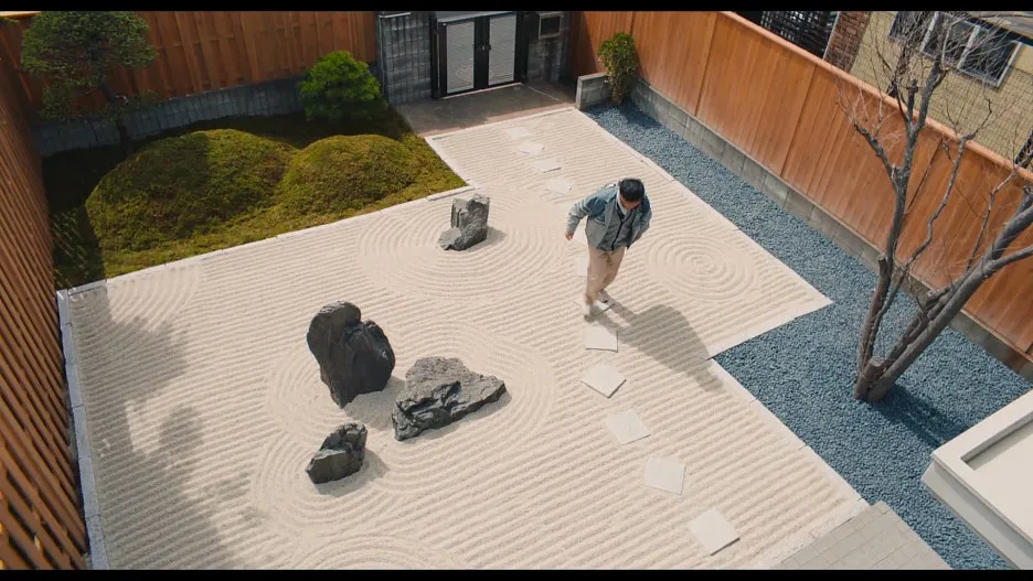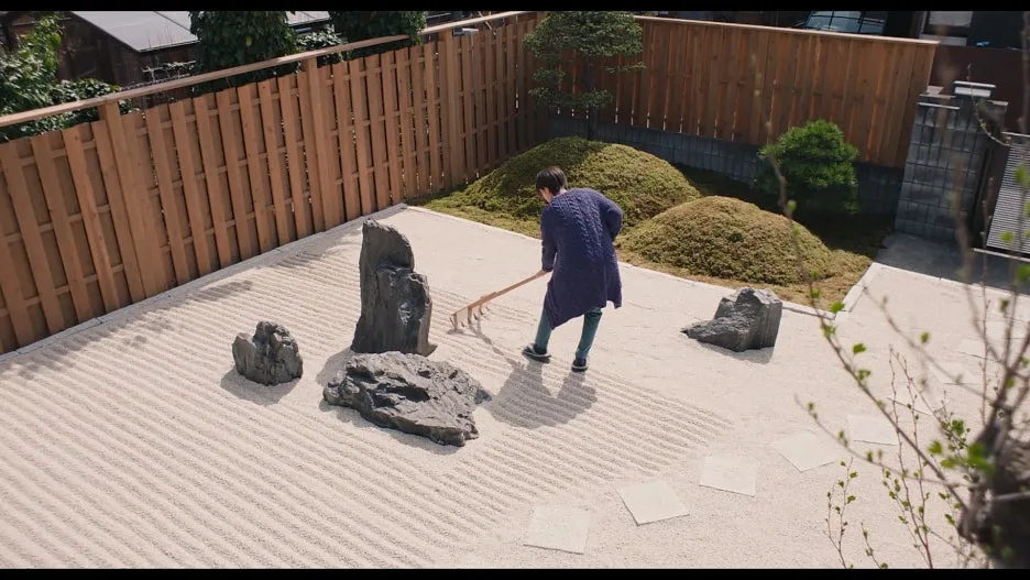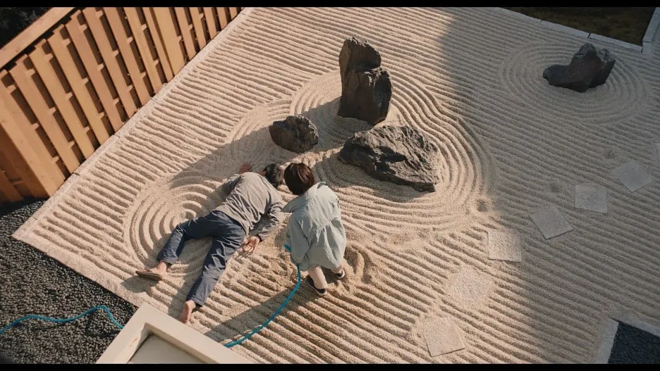 이후 요리코는 각자에게 숨겨진 복잡한 면, 나름의 사정이 있음을 깨닫고 숨 막힐 것처럼 틈이 없던 그녀의 일상에 여지를 주고 흠집을 내기 시작한다. 암 투병을 하던 남편의 서두른 죽음. 그토록 아끼던 모래 정원에 남편의 관이 나동그라지고 망자의 팔이 늘어지자 불시에 터진 요리코의 폭소. 엔딩에서 펼쳐지는 그녀의 강렬한 플라멩코 댄스와 무질서한 스텝에 의해 어지럽혀지는 가레산스이. 그녀의 완전하고 가지런한 일상은 산산이 부서지고 파괴되었다가, 아무것도 없는 비움의 상태에서 다시 흐르기 시작한다.