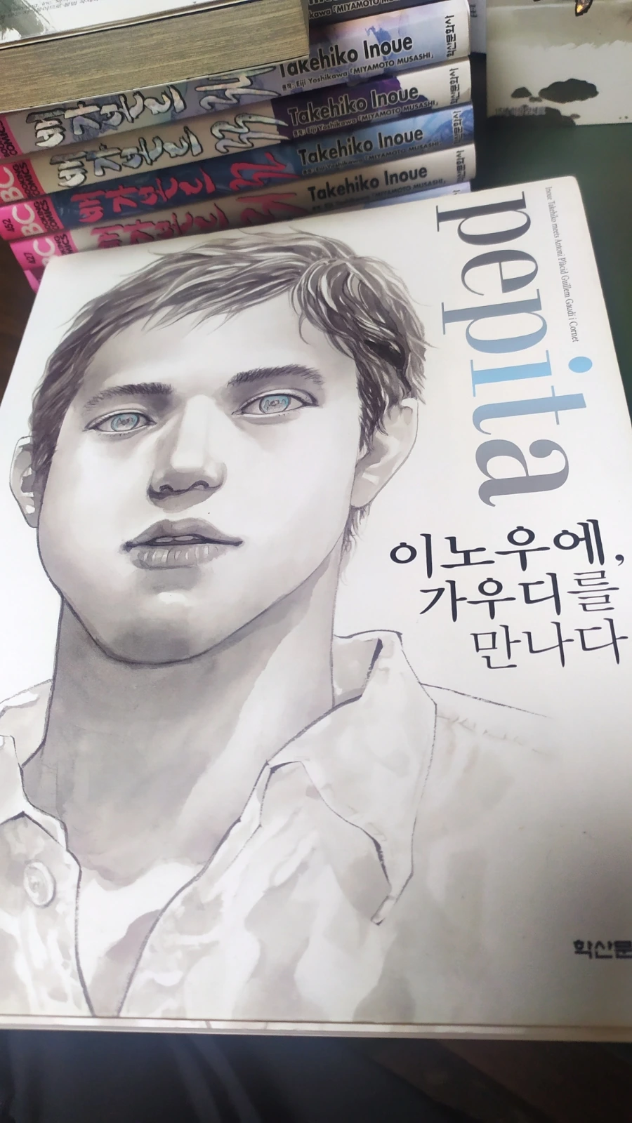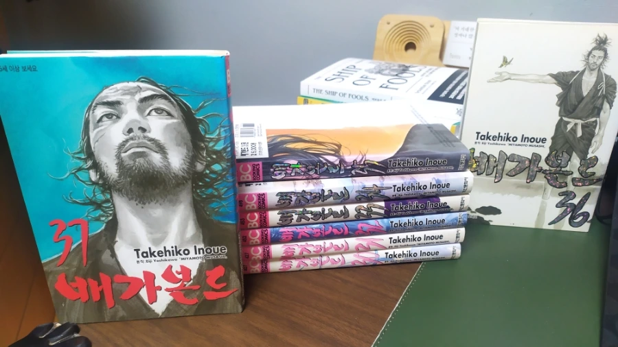 이노우에 다케히코. 90년대 <슬램덩크>로 누적 판매 부수 1억 7천만 부를 자랑하는 공전의 메가 히트 작가. 사실적이고 디테일한 데생, 보는 이의 감정선을 자극하는 성장 스토리와 심금을 울리는 명대사, 사실적이면서 코믹한 상황 설정으로 그의 작품들은 지금도 널리 사랑받고 있다. 개인적으로 난 그의 작품 중에 <배가본드>에 애착이 간다. 98년부터 연재한, 요시카와 에이지의 <미야모토 무사시>를 바탕으로 한 시대극. 요시오카 70명의 검객을 무참히 베고 나아가는 악귀를 닮은 무사시의 벼락 치는 듯한 검무가 압권이다. 집 서가에 소장 중인, 2014년에 출간된 37권을 끝으로 후속권이 나오지 않고 있다.