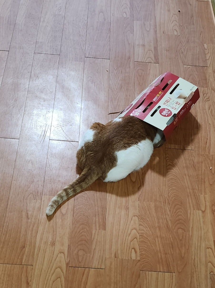고양이가 들어갈 만한 공간을 보자 마트에 가서 사 온 햇반을 다시 채워두고 아침이 되면 나 뒹구는 포장지를 파고들어요.