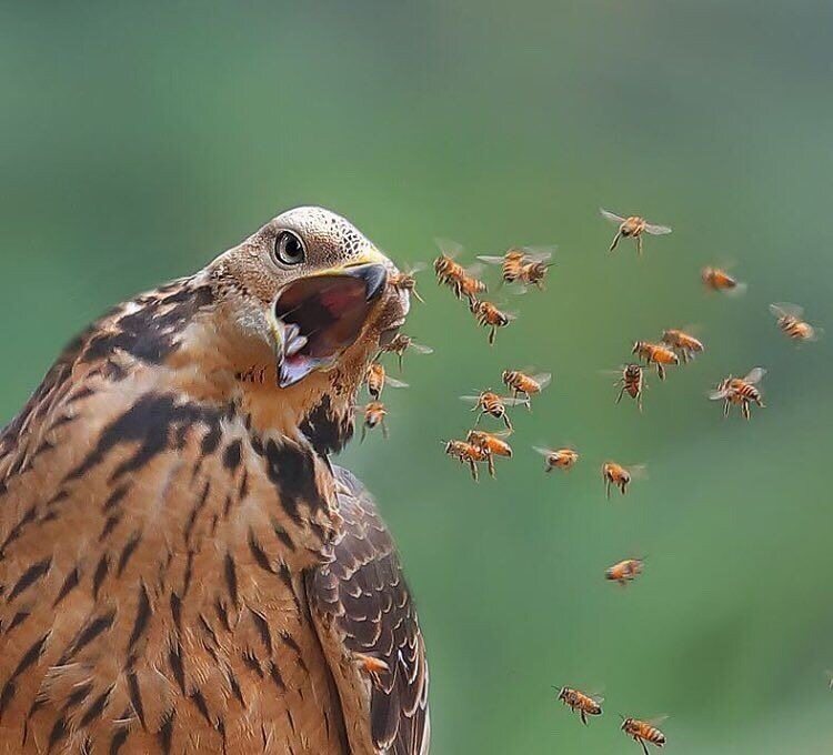 벌매에게 위협 비행을 하거나 독침을 쏘지만, 벌매는 오랜 세월 말벌 둥지 사냥에 특화되도록 진화했기 때문에 깃털이 마치 비늘처럼 빼곡하여 침이 피부를 찌르지 못한다고 합니다. 물론 맞았더라도 독에 내성이 있어 큰 위협이 되지 않습니다.