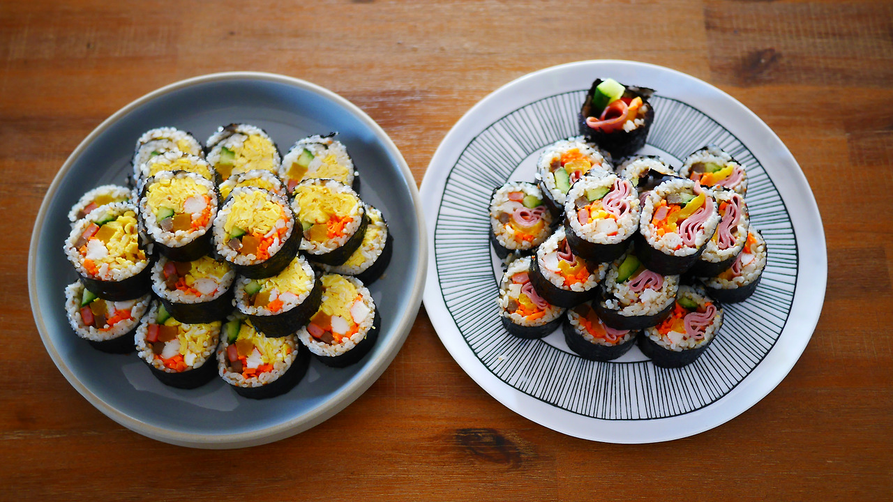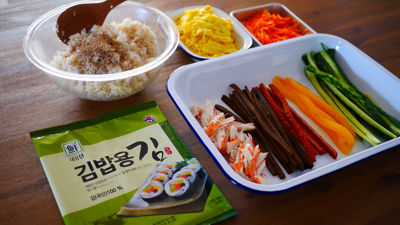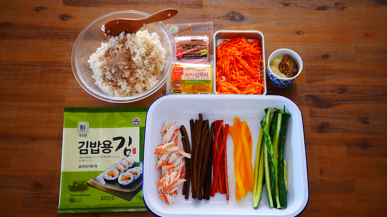# 김밥 공통재료: 밥(참기름, 소금, 깨), 오이, 단무지, 햄, 우엉, 맛살, 김밥용 김, 당근