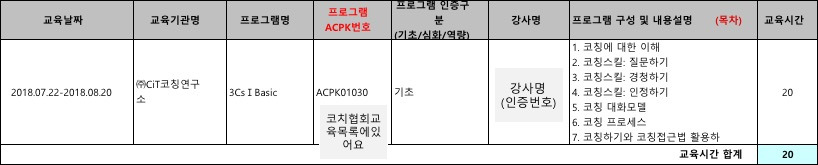 응시를 위해 필요한 20시간의 교육과정 수료는 2년전에 미리 해두었다. 한국코치협회에서 인증한 기관 및 프로그램을 수료해야 하고 사이트에 교육 목록이 나와있으니, 맞는 스타일로 선택해서 들으면된다.