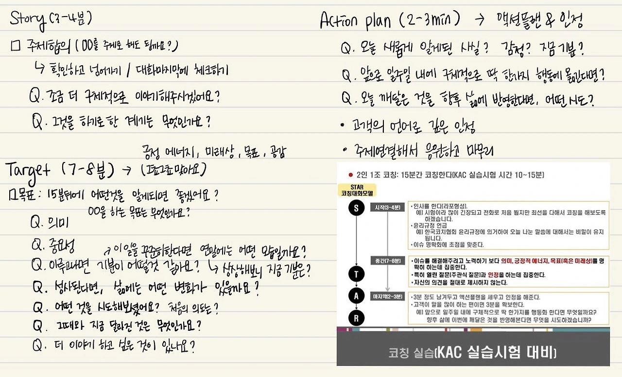 한국코치협회 사이트 구석구석과 ICF 핵심역량 모델만 잘 읽어보면 된다고 들었다. 시험 3일전까지 아무것도 못하고 미루다가, 하루밤 날을 잡고 홈페이지 전체를 구석구석 클릭해가며 필요한 내용을 전부 워드 파일에 복사+붙여넣었다. 코칭의 정의, 역사, 윤리관련 내용, 그리고 커뮤니티탭 (-고객센터-FAQ) 위주로 모아서, ICF 핵심역량과 함께 PDF파일로 만들었더니, 22페이지짜리 워드 파일이 완성됬다. 3회독 후 시험에 응시했고, 처음보는 내용이나 곤란한 질문은 없었다. 은근히 헷갈렸던 것, 코더코 어떻게 어떻게 진행시 몇분으로 기록이 가능한가? ㅠㅠ