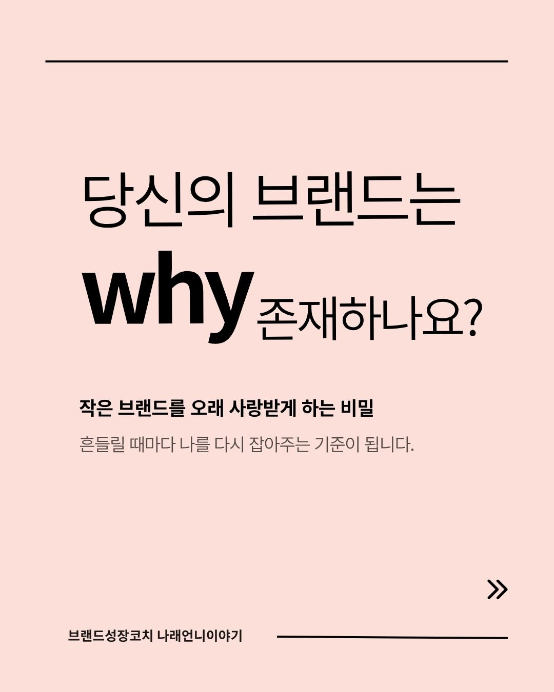 "당신의 브랜드는 왜 존재하나요?"라고 물을 때 이 질문에 답하지 못한다면 앞으로의 내 브랜드의 방향을 잃고 헤매기 쉬워요. 가야 할 방향을 찾지 못해 가다 멈춰 서고, 누군가를 따라가기 바빠지고, 내가 왜 시작했는지 조차도 모르고 우왕좌왕하게 되죠. 그래서 브랜드를 시작하기 전에, 내 브랜드가 왜 존재하고, 왜 필요한지에 대한 이유를 찾고, 고민해 봐야 합니다.