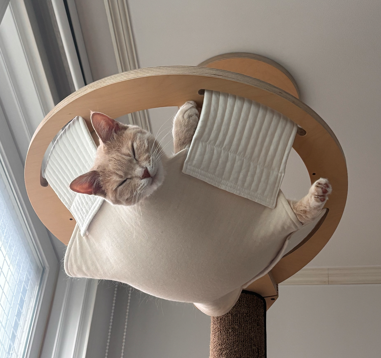 잠을 잘 때는 나는 침대 카루는 침대 옆 캣폴 꼭대기가 지정 자리이다.