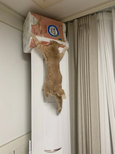 자꾸 에어컨 위를 올라가길래 막았더니 저기에 발톱을 박아버리셨다.