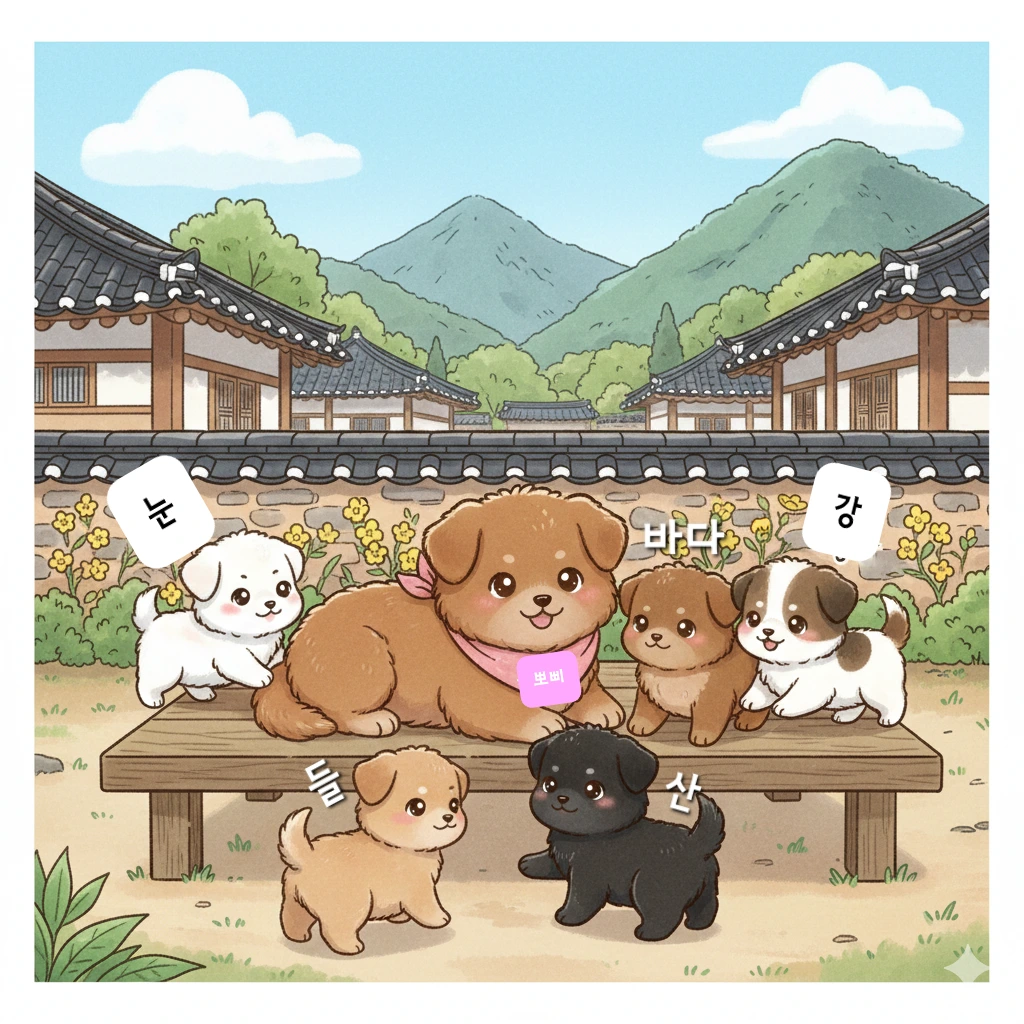 마당 끝 평상 아래눈도 못 뜬 귀여움들이작은 발바닥을 딛고 깨어났다.언니와 머리 맞대고지어준 이름들.듬직했던 산과잘 달리던 들,맑은 눈망울의 바다와 강,그리고 하얗고 포근한 눈.뽀삐의 품 안에서다섯 자연이 꿈틀거릴 때나는 온 세상을 다 가졌었다.눈 오는 산과 들 강, 바다에 가면 그때의 귀여움들이내 마음으로 쪼르르 달려온다.