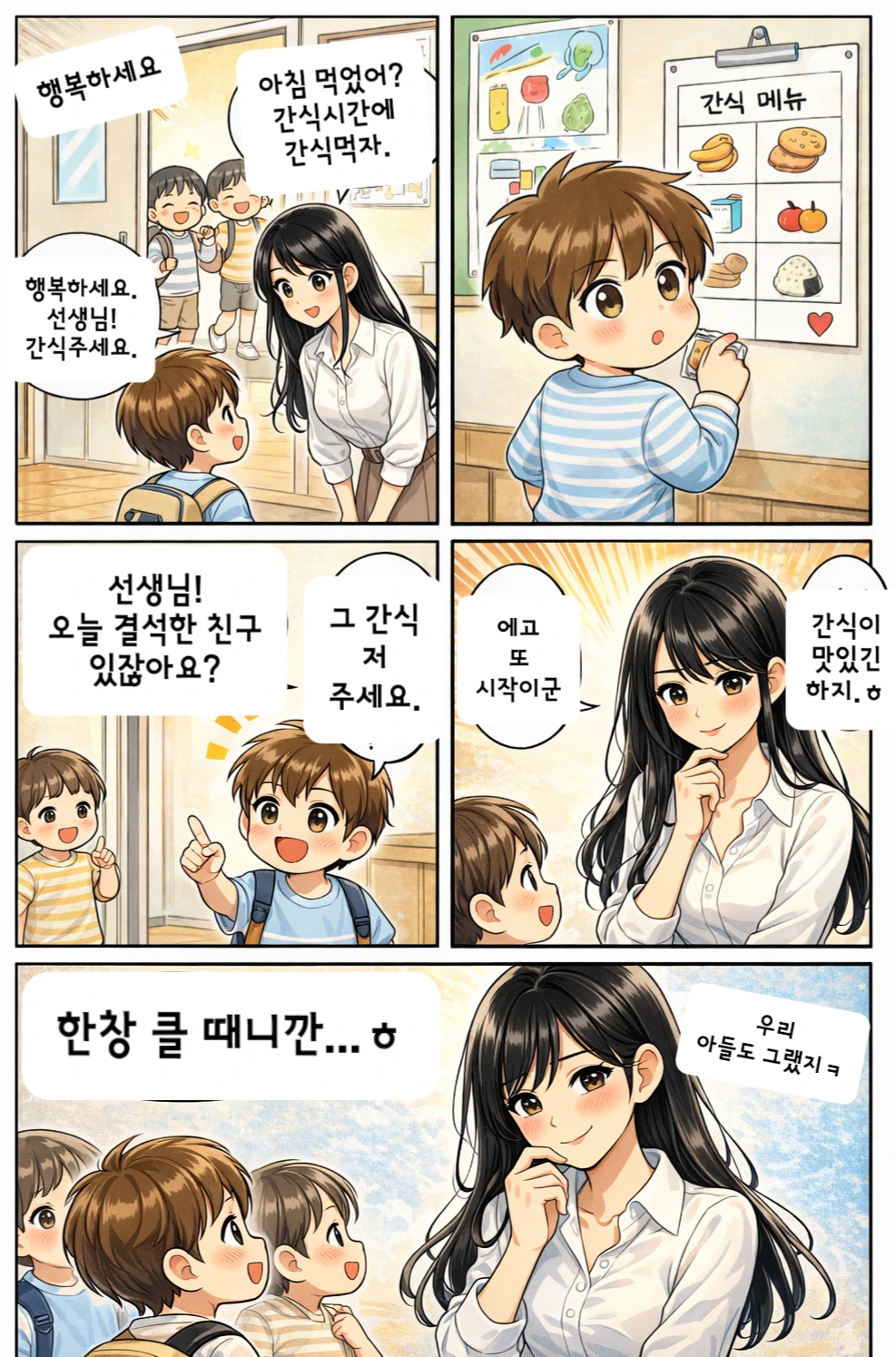 빈자리를 귀신같이 찾아내는 그 집요하고도 사랑스러운 계산법. 나는 짐짓 엄한 표정을 지어 본다. 아들이 있는 나로선 "남자 아이들은 역시 잘먹는구나" 라며 공감하며 웃음이 새어 나온다. 남는 것을 선뜻 주고 싶은 마음과 그 모습을 바라보는 다른 아이들의 눈동자 사이에서 나는 오늘도 작은 줄타기를 한다. 형평성이라는 교실의 규칙과 허기진 아이의 진심 사이에서. 오늘도 아이는 초롱초롱한 눈으로 나를 바라본다. 매번 원하는 만큼 다 줄 수는 없지만 아이의 "간식 주세요."라는 말이 가끔은 이렇게 들리기도 한다.