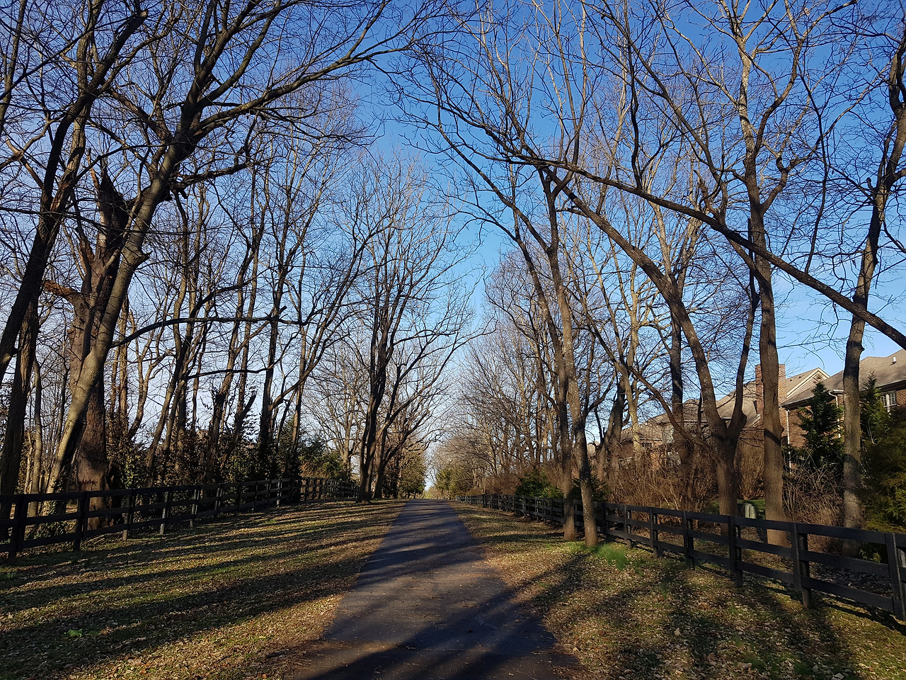 산책로에서 내가 가장 좋아하는 나무는 단연 호랑가시나무이다. 크리스마스 카드에서 많이 본 나무인데 윤이 자르르한 초록 잎사귀에 루비 귀걸이처럼 빨갛게 빛나는 작은 열매를 가득 달고 있는 모습이 무척 아름답다. 호랑가시나무를 지나서 조금 더 걸으면 산책로의 끝에 다다른다. 펜스가 세워져 있고 그 너머로는 드넓은 벌판이 펼쳐져 있다. 켄터키의 자랑인 말을 키우는 농장인 듯하다.