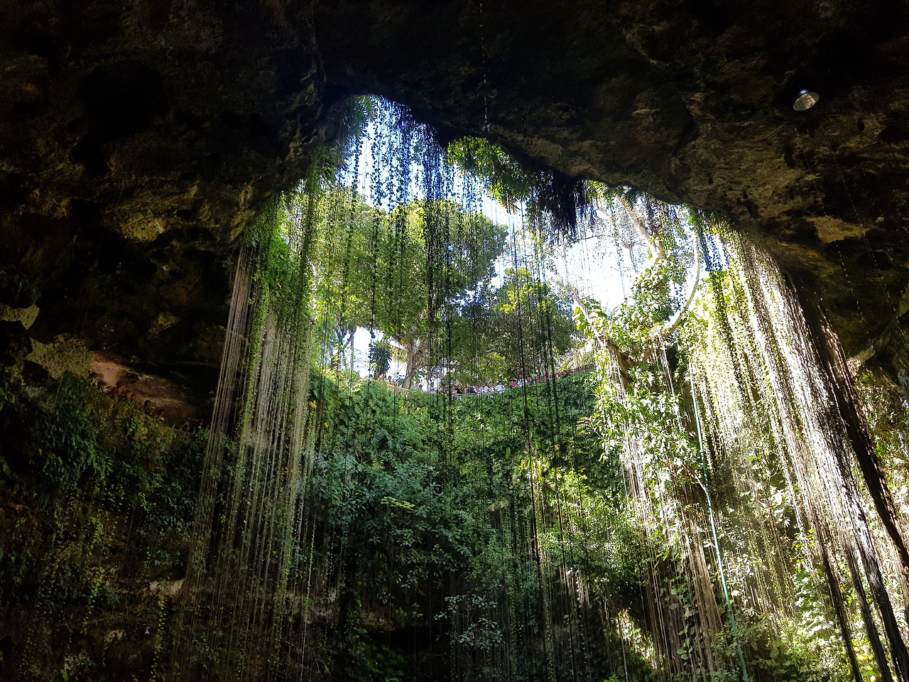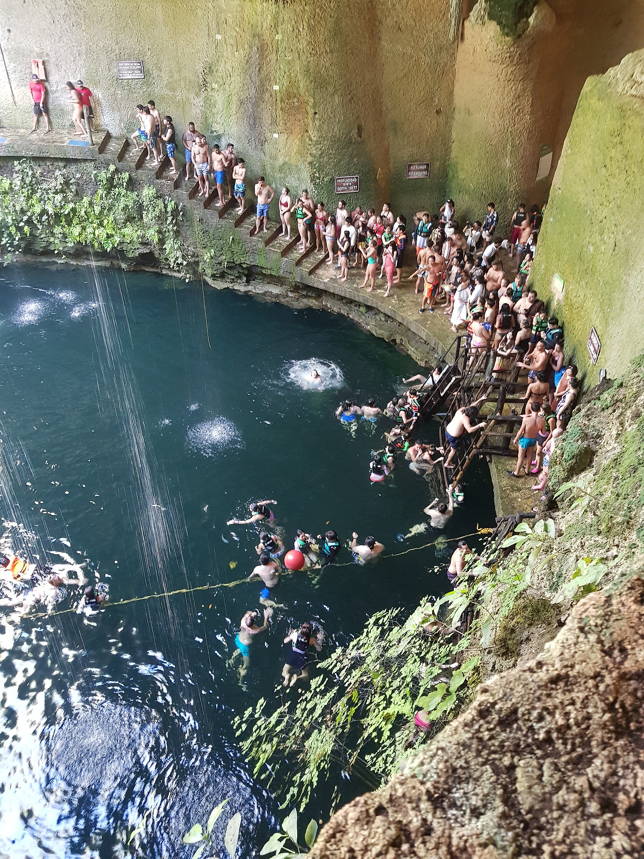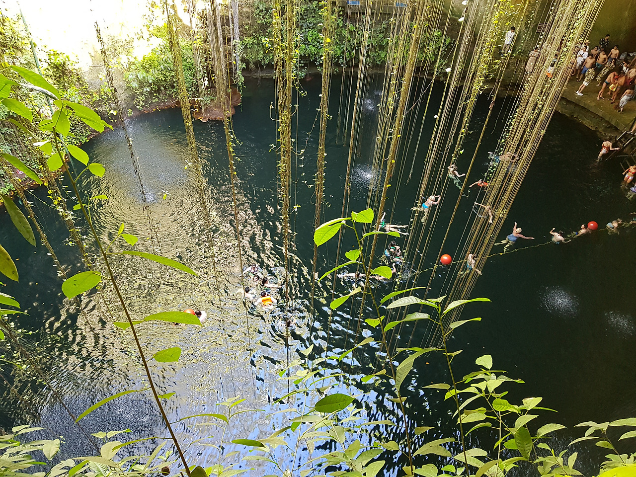 그다음 장소는 Ikkil Cenote(이낄 세노떼). 지하동굴처럼 생긴 깊은 싱크홀에 우물처럼 물이 가득 차 있는데 무척 아름답고 신비스러운 곳이다. 이곳에서는 수영을 즐길 수 있는데 우리는 1불 주고 빌린 구명조끼를 입고 사다리를 타고 내려간 반면 수영을 잘하는 서양사람들은 맨몸으로 멋지게 다이빙을 해서 들어간다. 무엇인가 잘한다는 건 그만큼 자유로워진다는 것이겠지.